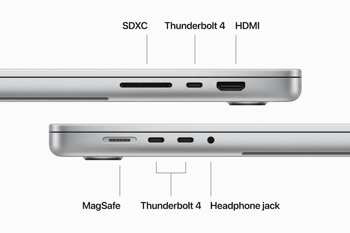 This MacBook Pro features a MagSafe charging port, three Thunderbolt 4 ports, an SDXC card slot, an HDMI port and a headphone jack. Enjoy fast wireless connectivity with Wi-Fi 6E5 and Bluetooth 5.3. And you can connect up to two external displays with M3 Pro.