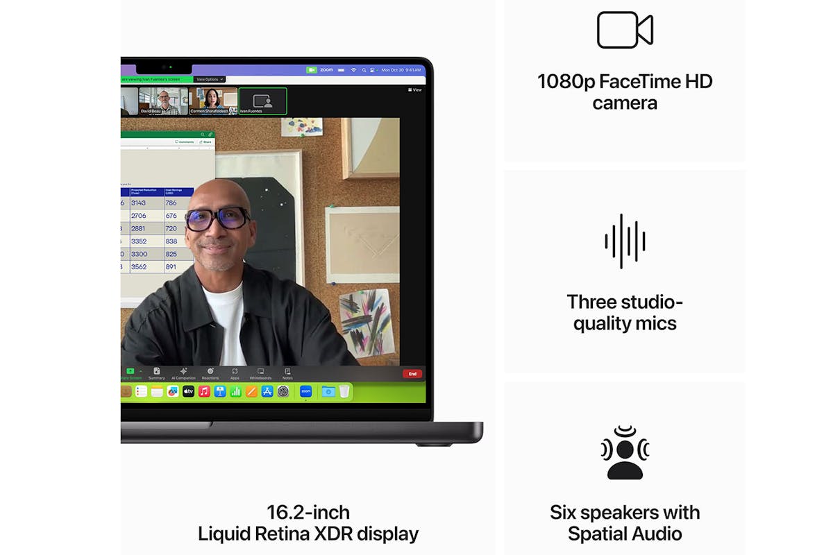 Look sharp and sound great with a 1080p FaceTime HD camera, a studio-quality three-mic array and a six-speaker sound system with Spatial Audio.