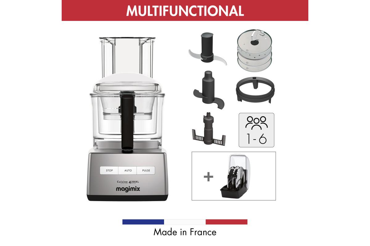 The Magimix 4200XL food processor is perfect for catering up to 6 people. With a minimal footprint for such a powerful and versatile machine, the 4200xl kneads up to 2 loaves (1kg) and grates up to 1kg vegetables in the main bowl.