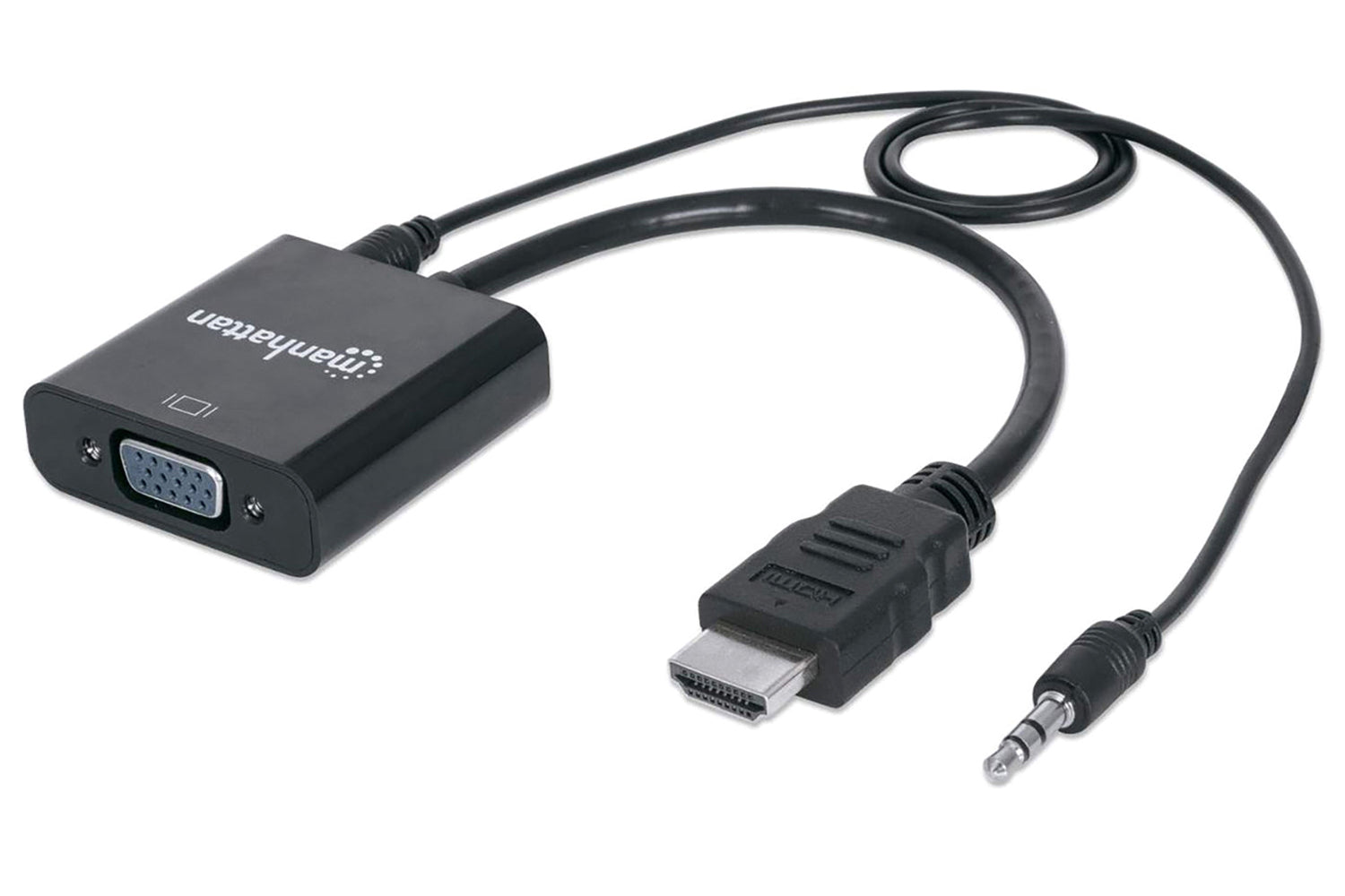 The Manhattan HDMI to VGA Converter helps establish a fast, simple and convenient link between newer HDMI-equipped desktop and notebook computers and other media sources with existing VGA monitors, projectors and other display devices.The Manhattan HDMI to VGA Converter is easy and quick to install and requires no complicated configuration or setup to help extend the service life and fully realize the investment and value of legacy VGA displays, projectors and other equipment. This low-power, cost-effective and reliable solution allows users to transition to HDMI bandwidths, resolutions, deep color and more without the expense of upgrading to newer and costly monitors and projectors.Its integrated, all-in-one design helps achieve a compact, integrated solution that eliminates unnecessary cables, tangles and clutter to keep installations and work spaces neat and orderly. Its 3.5mm stereo port allows the converter to transmit audio to an external audio device with convenient, included 3.5mm audio cable, and its Micro-USB port allows for additional power if required.