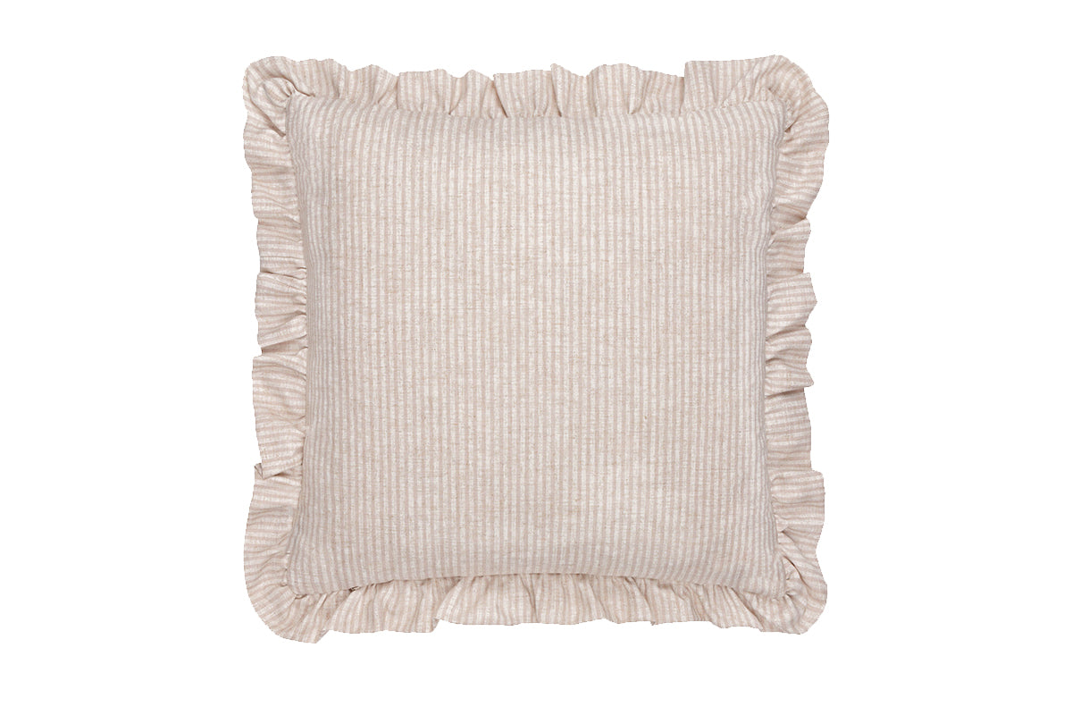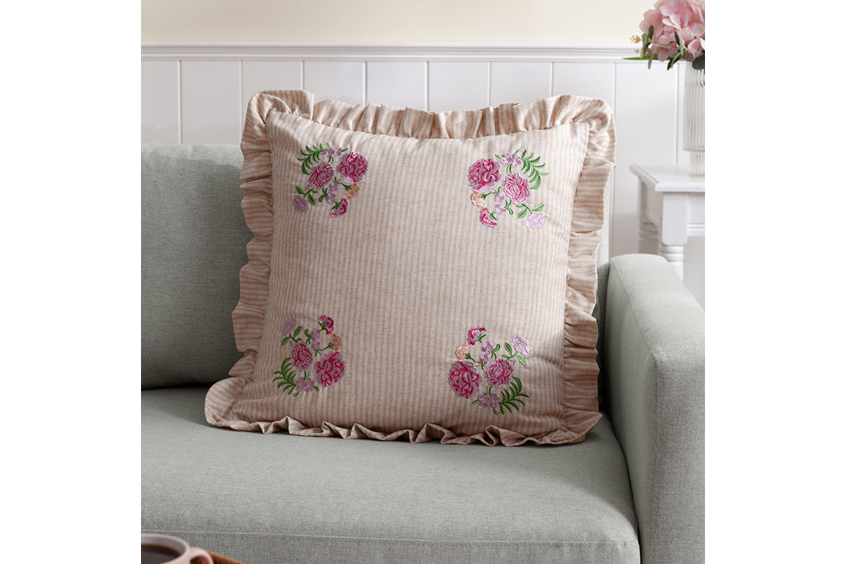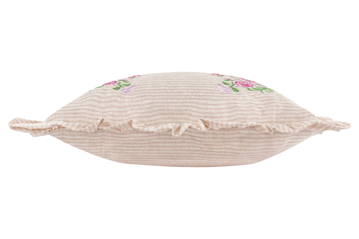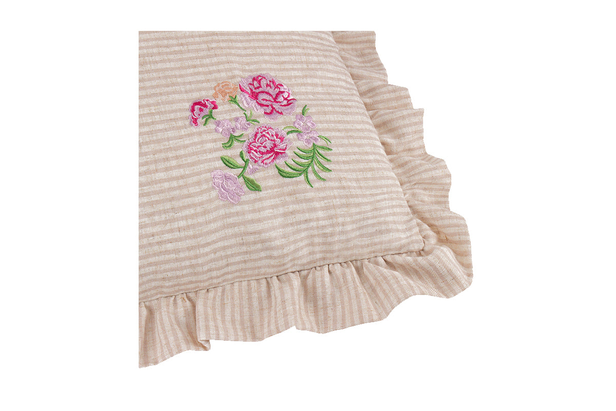 Crafted from a soft, neutral-toned fabric with subtle vertical striped, the Martha cushion brings a touch of timeless charm to any room. The delicate ruffled edging adds a gentle, romantic flourish, while the four embroidered floral bouquets offer a hand-crafted, vintage-inspired look. Whether used as an accent piece or part of a layered arrangement, it adds warmth and softness to any area.