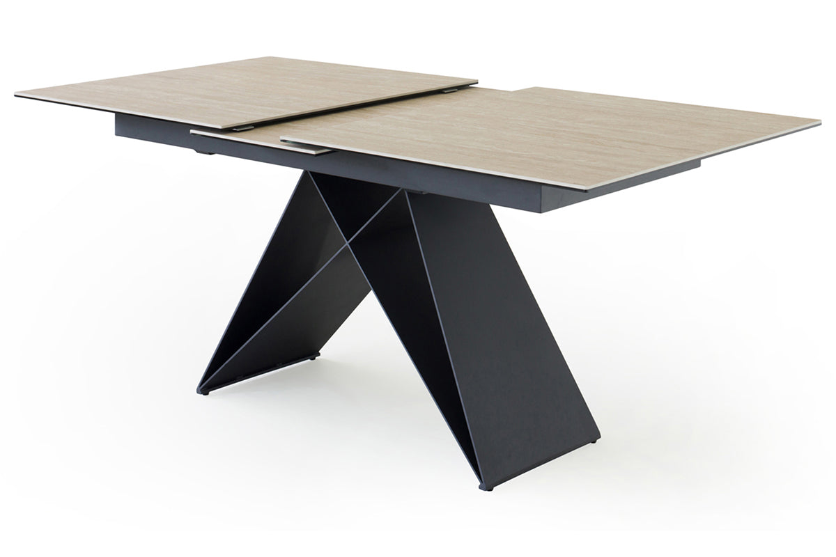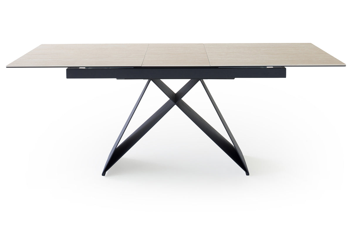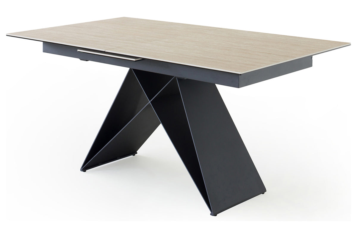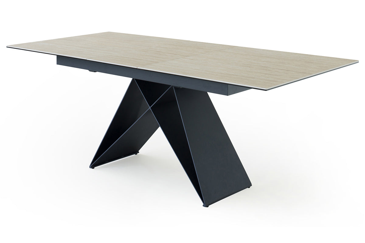 The Massimo extending dining table is perfect for hosting large gatherings. The grey, stone-effect, ceramic top is juxtaposed with a black metal X frame base for an ultra-modern, almost science fiction look.