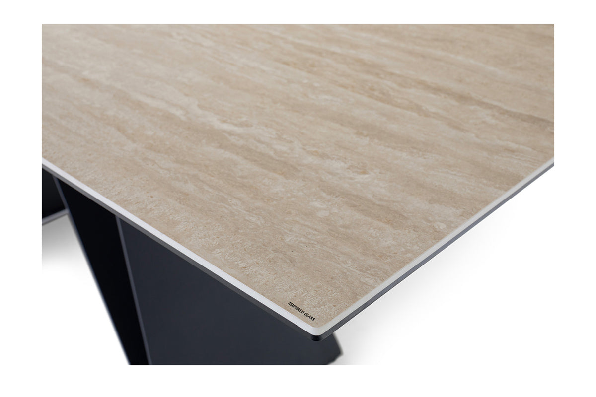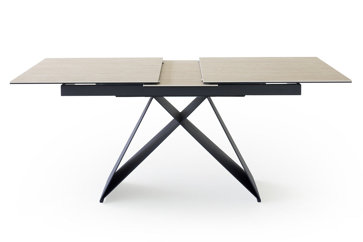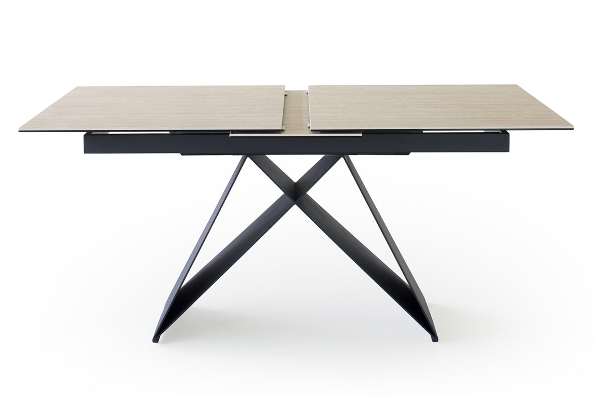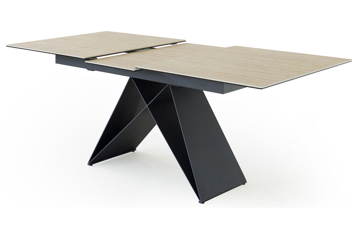 The Massimo extending dining table is perfect for hosting large gatherings. The grey, stone-effect, ceramic top is juxtaposed with a black metal X frame base for an ultra-modern, almost science fiction look.