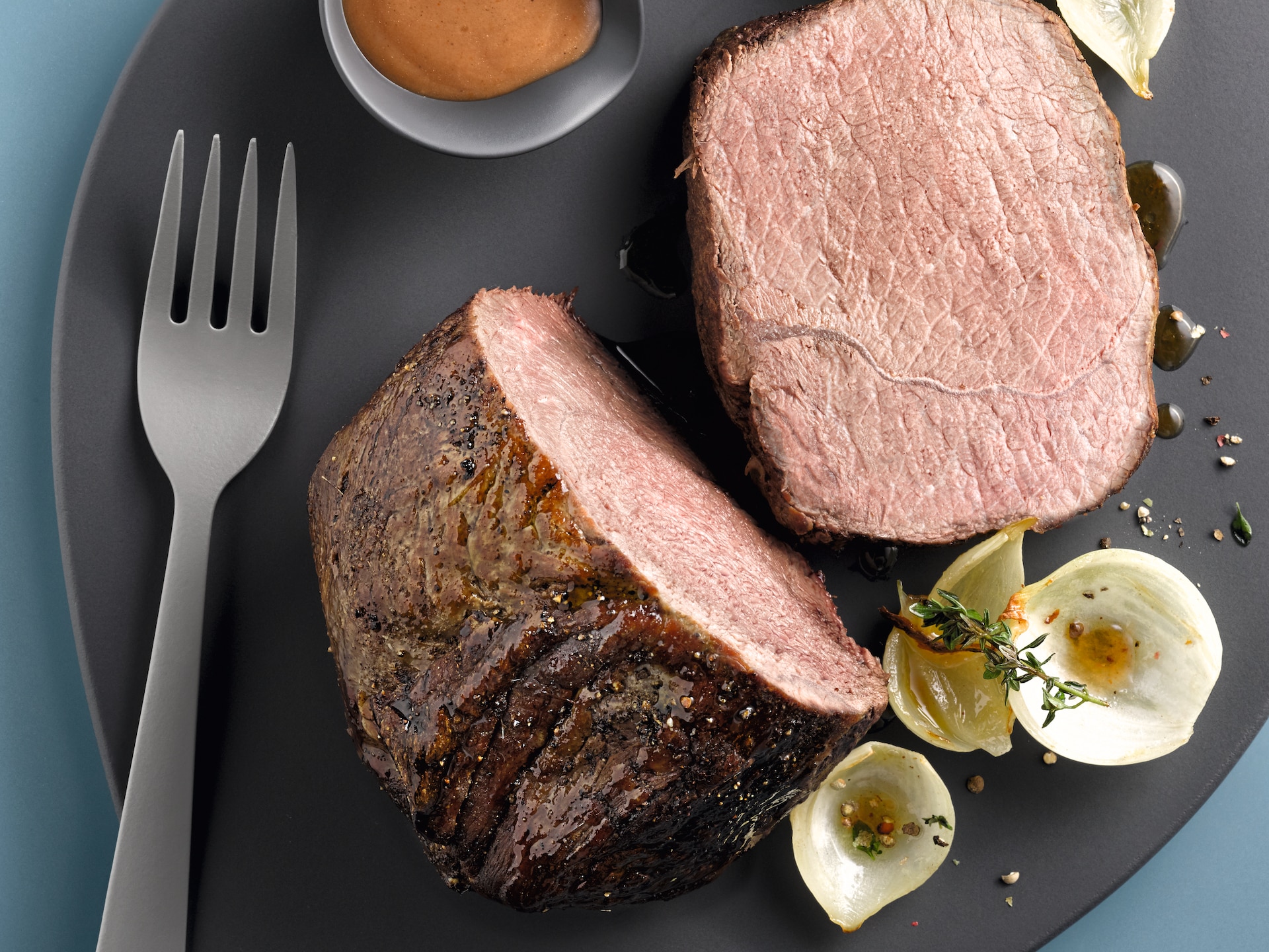 Meat remains tender and succulent: meat is seared at a high temperature, then roasted at a selected temperature.