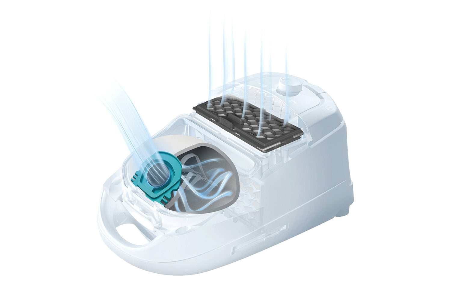 Thanks to several filter layers (fine) dust that has been vacuumed up cannot escape into the room air.