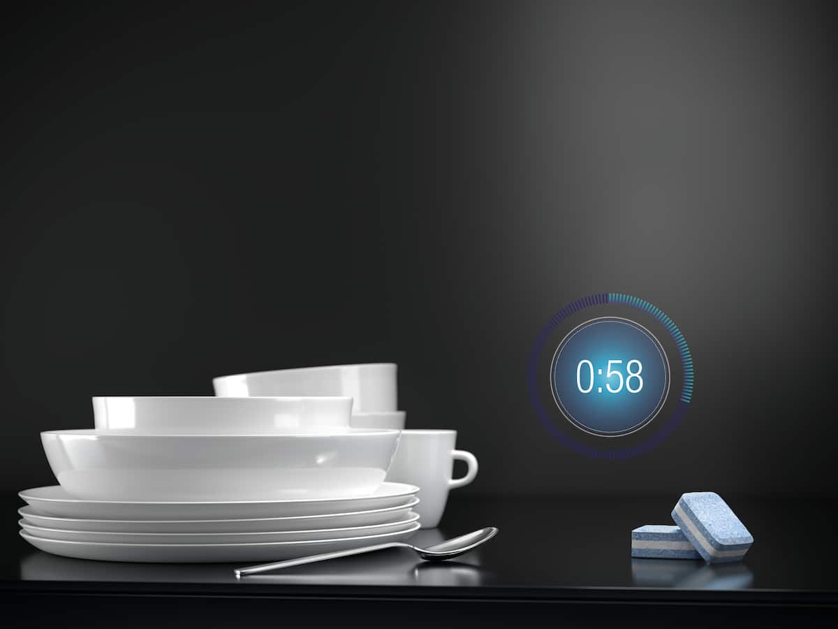 An unbeatable combination: the QuickPowerWash programme and the perfectly tailored dishwasher detergent achieve the best possible cleaning and drying results on normally soiled crockery in 58 minutes. The specially developed tabs or powder in the PowerDisk only take 2–3 minutes to dissolve. This means that the cleaning performance begins right at the start of the wash cycle.