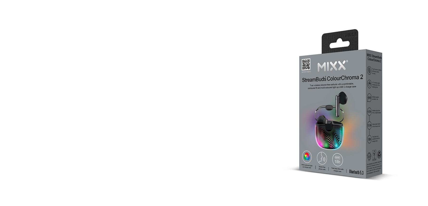 The hybrid design features contoured, silicone-free earbuds for a secure and comfortable fit, making them ideal for extended wear. Compact and lightweight, the pocket-sized charging case is perfect for those on the move. Whether commuting, working, or relaxing, the MIXX StreamBuds Colour Chroma 2 delivers premium sound and standout style.