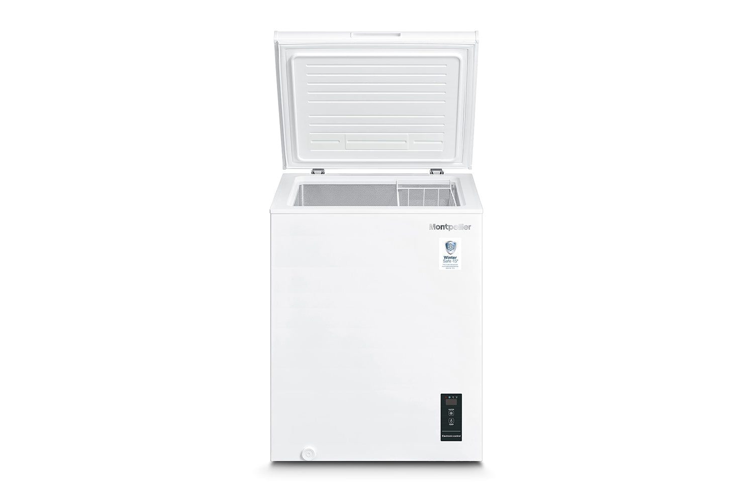 This 142-litre capacity chest freezer by montpellier comes with a storage basket, counter-balanced lid and easy clean interior.