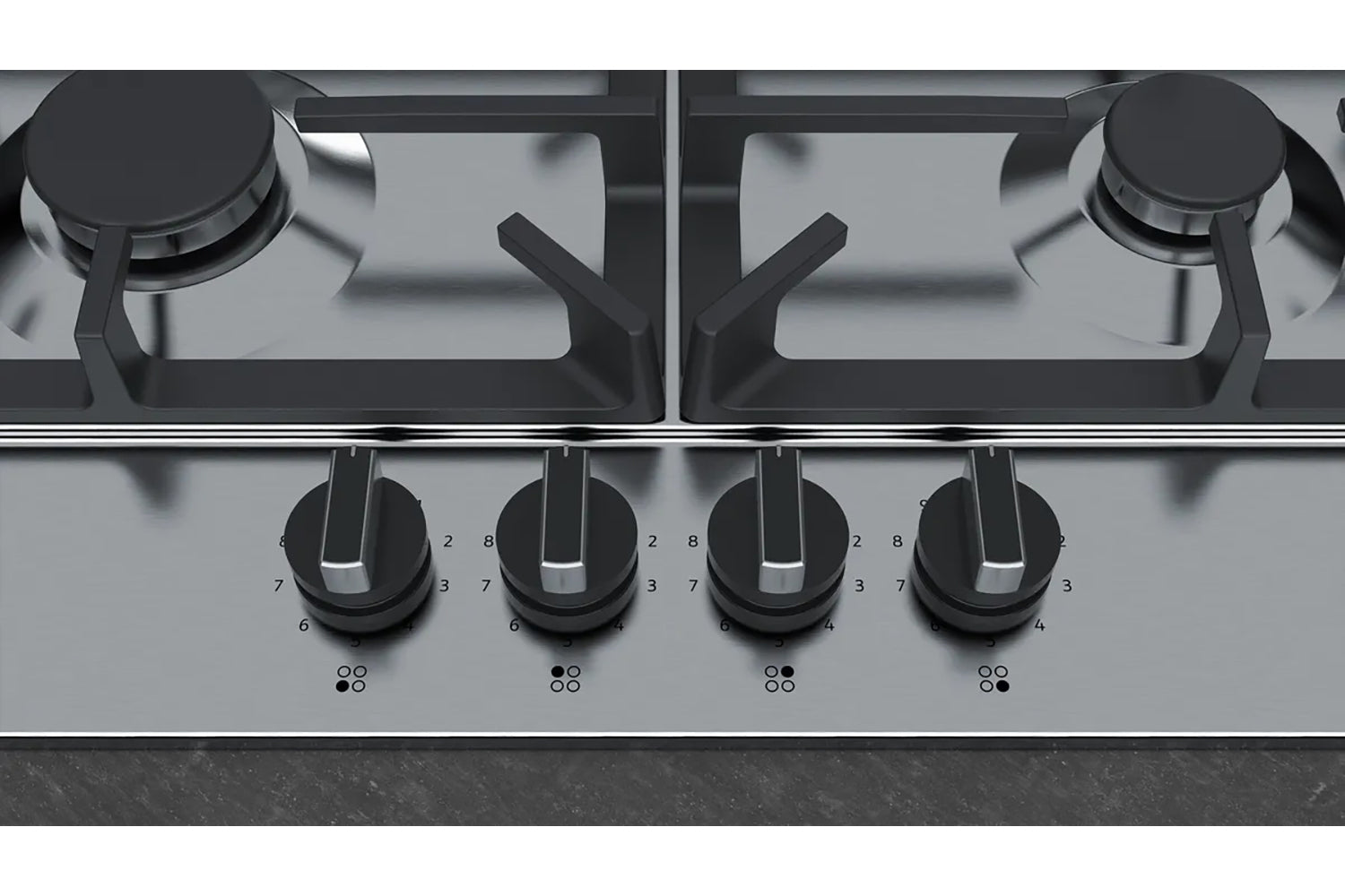 The clever control of gas flow, the flame can be precisely adjusted in 9 steps. Always the same reliable and precise power levels for outstanding cooking convenience. Continuous cast-iron pan supports for maximum stability and cooking convenience. Design co-ordinated control dials easy to operate in an attractive design.