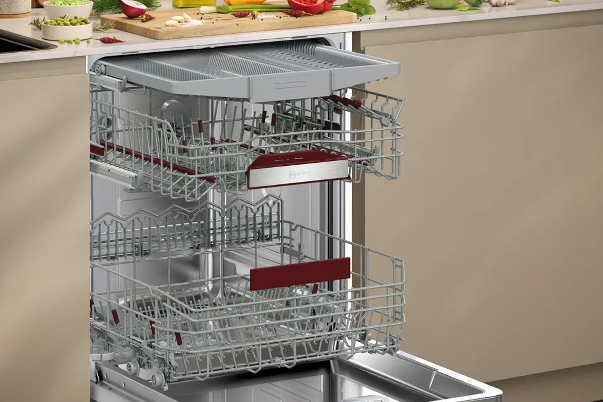 Your Flex Cutlery Drawer is a safe spot for your cutlery, knives, or kitchen utensils, while your Flex 2 Baskets offer six foldable flip tines each in the top and bottom baskets. Simply flip the Touchpoints in NEFF red and adapt the baskets accordingly. You would like to add a few items to the bottom basket? Neff 3-stage Rack Matic top basket can be lifted any time - even if it's already fully loaded. Soft silicone sliding protectors in the top basket take great care of your glasses, and a higher frame in the bottom basket gives solid support to tall items like chopping boards.