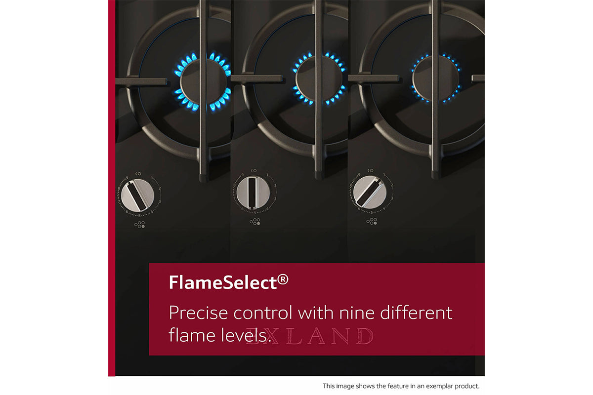 Control your gas hob by numbers and not by eye! The Flame Select technology regulates the gas output precisely. And because the amount of gas in each of the 9 levels is defined, you ́ll get same cooking results over and over again. Another benefit of the precise steering is that it prevents uncontrolled boling or splashing, which makes cleaning after cooking easier. The product design may differ from the illustration.