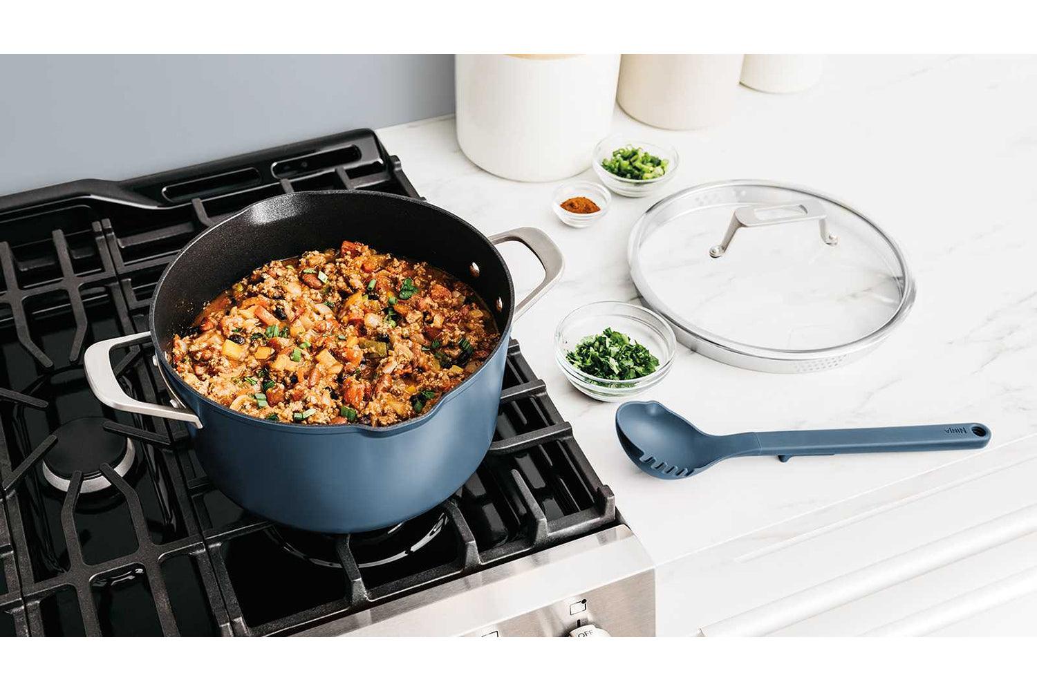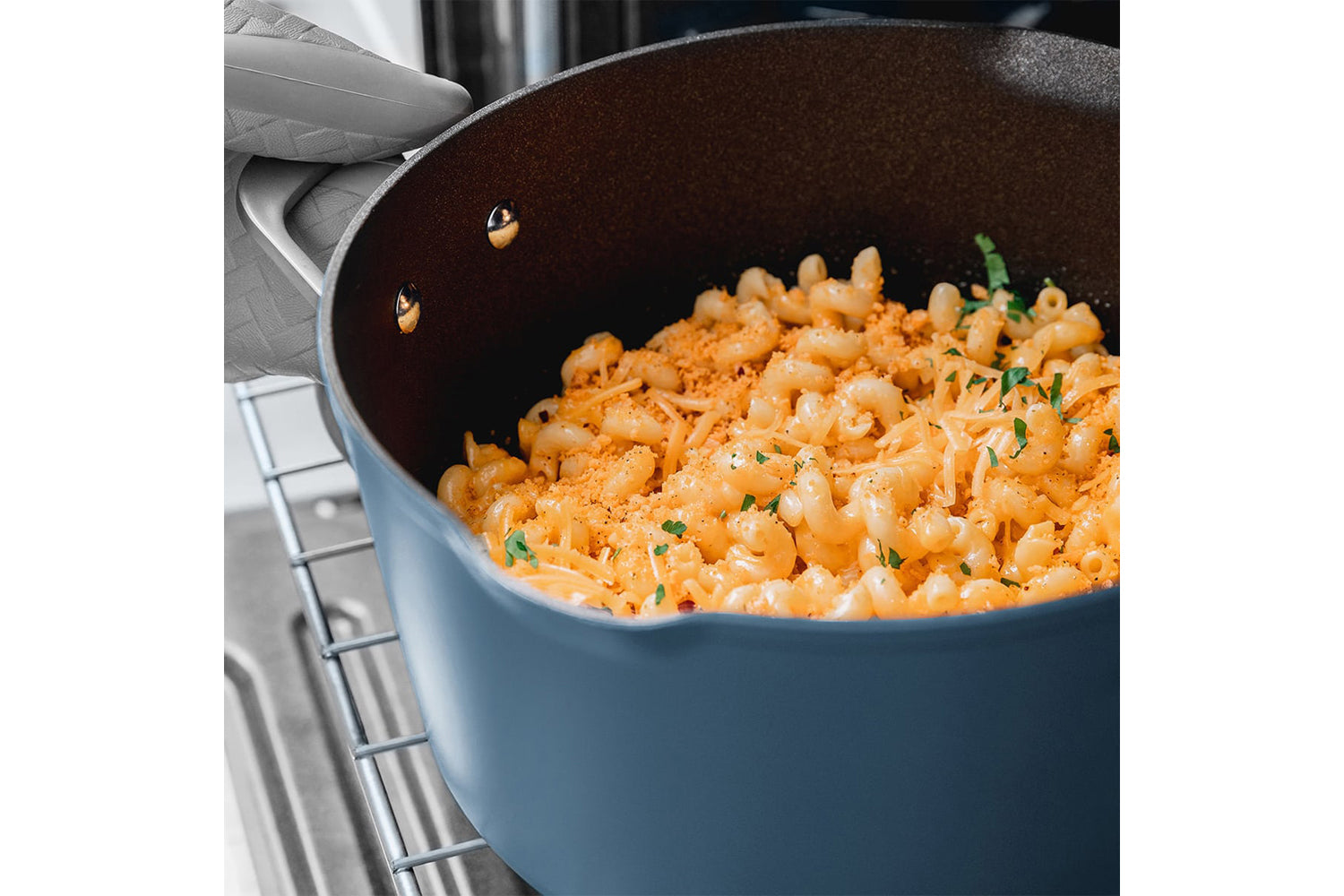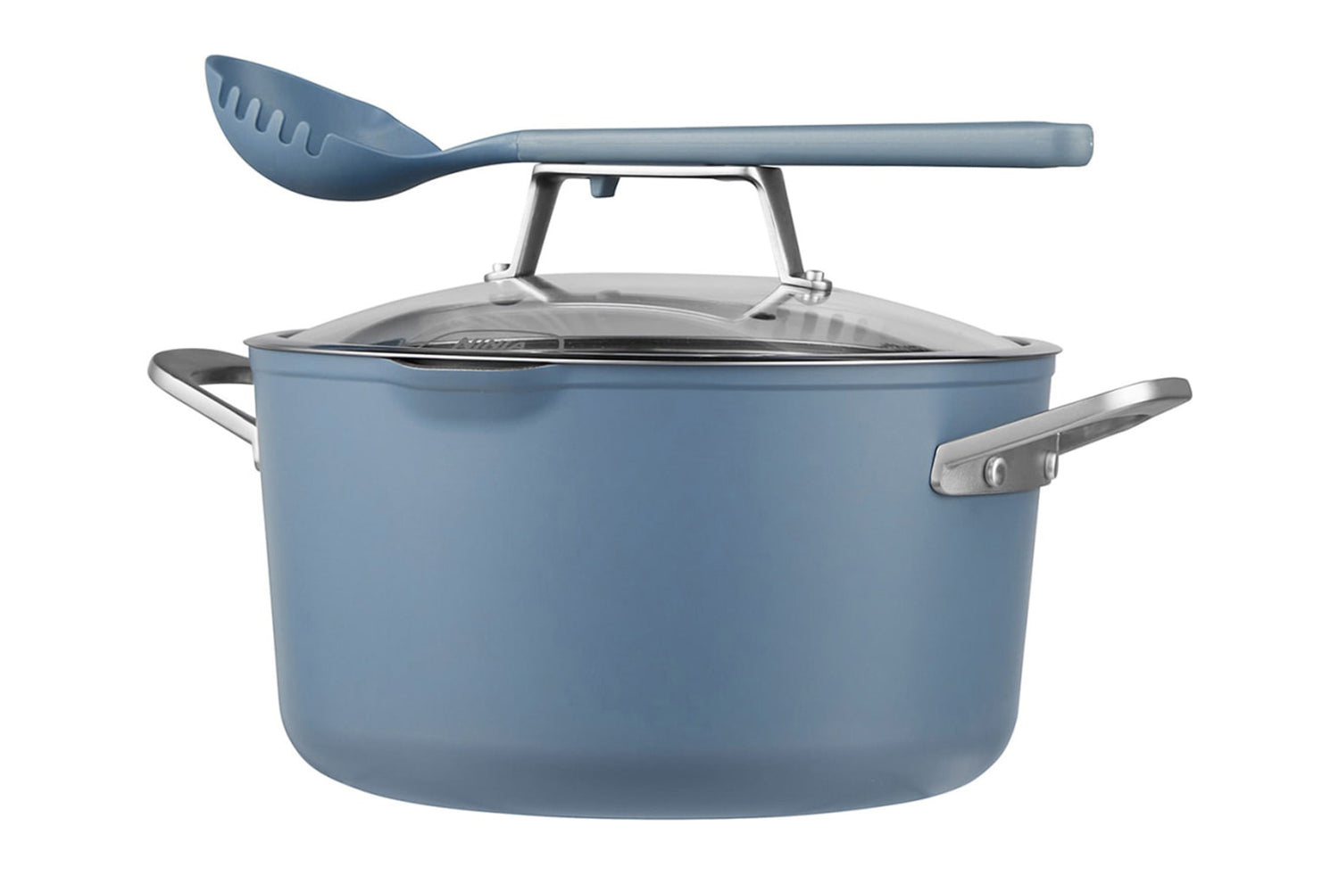The heat-tempered glass lid features a built-in strainer to easily drain pasta, and a convenient integrated multifunctional utensil that can be used both as a ladle and pasta fork for easy stirring and serving.