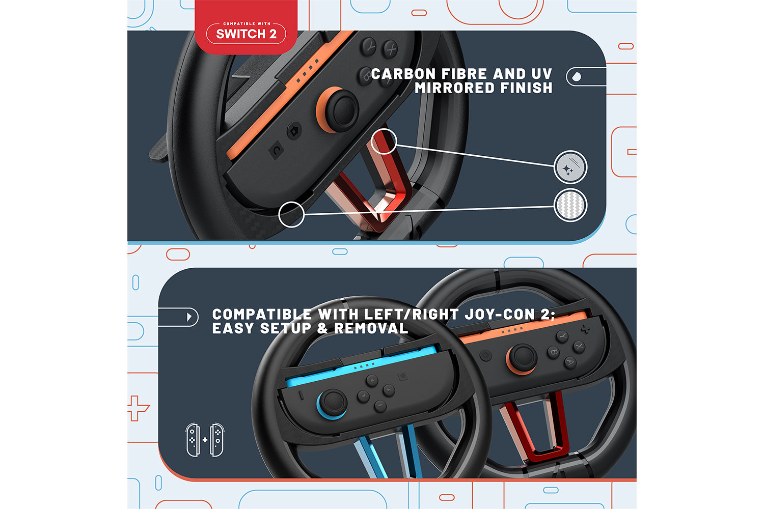 Twin racing wheels compatible with Joy-Con 2 controllers to make the latest racing games even more exciting.