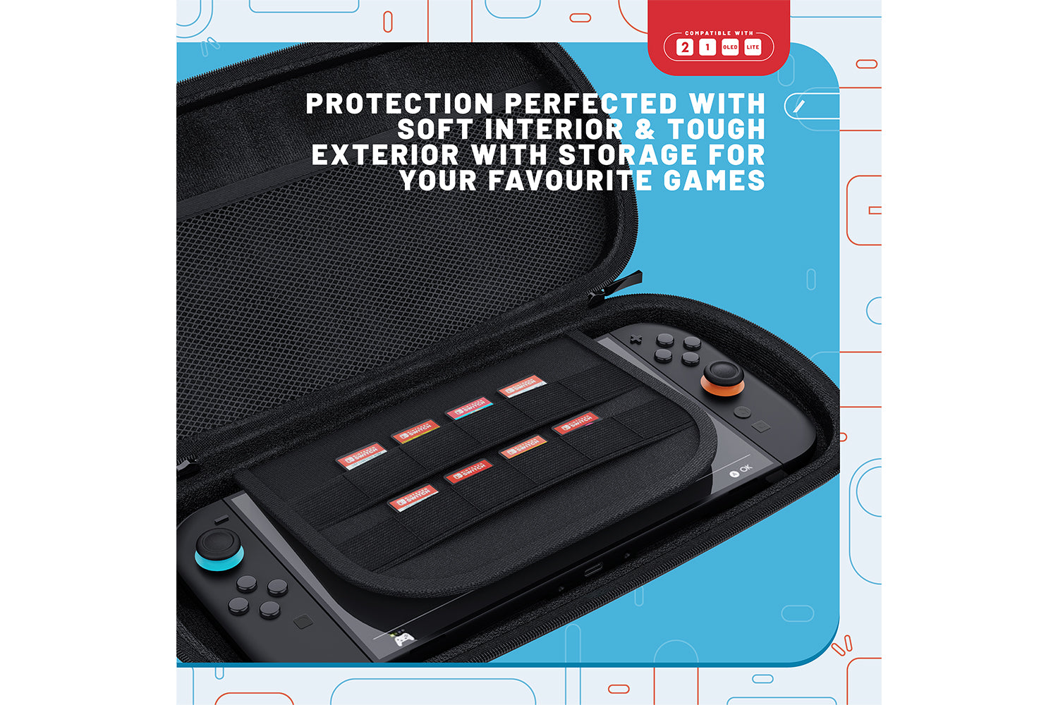 The case’s soft cotton lining keeps your console scratch-free, with storage for up to 12 of your favorite games. It also features a foam adapter for compatibility with Switch, OLED, and Lite models.