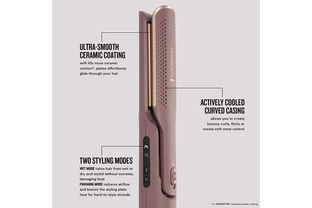 Switch to Finishing Mode to reduce the airflow and boost the temperature of the styling plates to smooth those pesky hard-to-style strands or refresh your style between washes. Ionised air helps eliminate static and instantly cools your hair while styling to lock in 80% smoother results[2]. The ultra-smooth plates with 10x more ceramic[3] content ensure the styler glides effortlessly through the hair while releasing heat-activated micro-conditioners for all-day frizz protection.