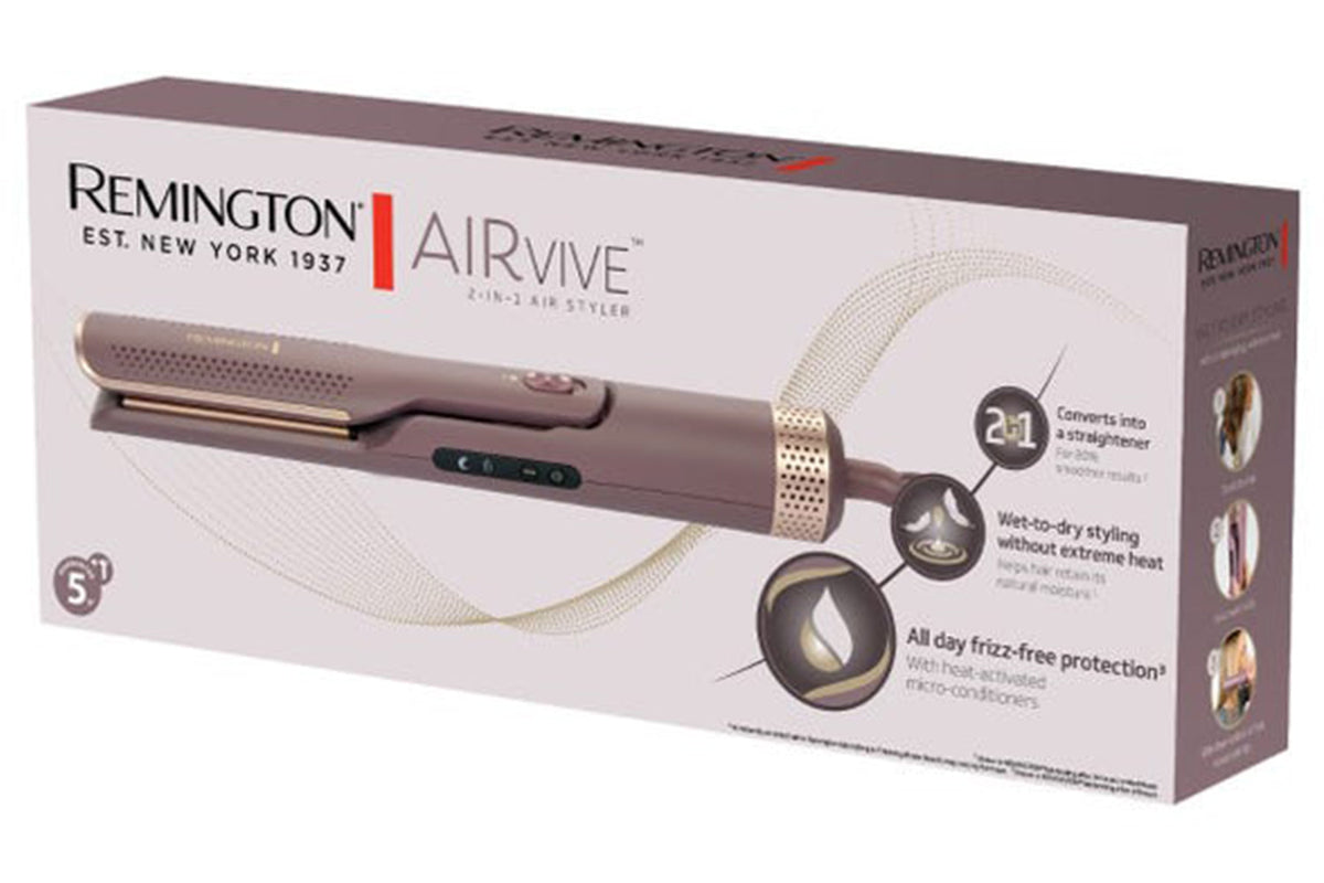 Become a frizz whisperer with the Airvive 2-in-1 Air Styler from Remington. Designed to be tough on frizz but gentle on your hair, this versatile 2-in-1 styler will transform your styling routine forever. With two styling modes, it can be used to dry and smooth damp hair, as well as straightening and styling dry hair.