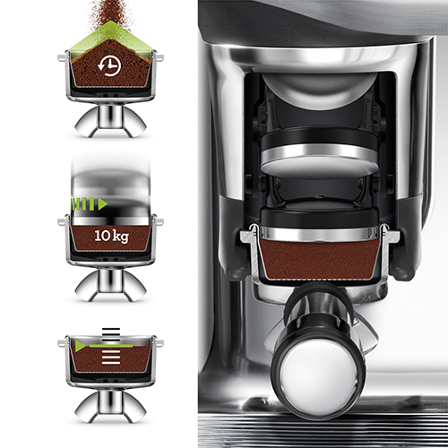 Intelligent dosing, assisted 10kg tamping and auto correction of the next dose to achieve a precise puck, finished with a 7º barista twist. Simplifies the steps needed to grind, dose and tamp to create an impressive puck.
