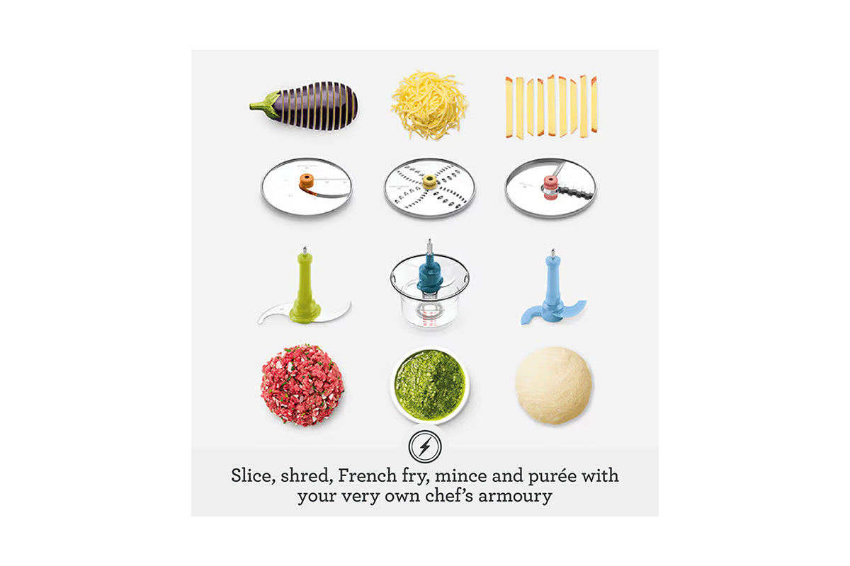 Slice, shred, French fry, mince and purée with your very own chef’s armoury. Includes a 24 size adjustable slicer, reversible shredding disc, French fry disc, Quad blade, dough blade and mini blade & bowl.