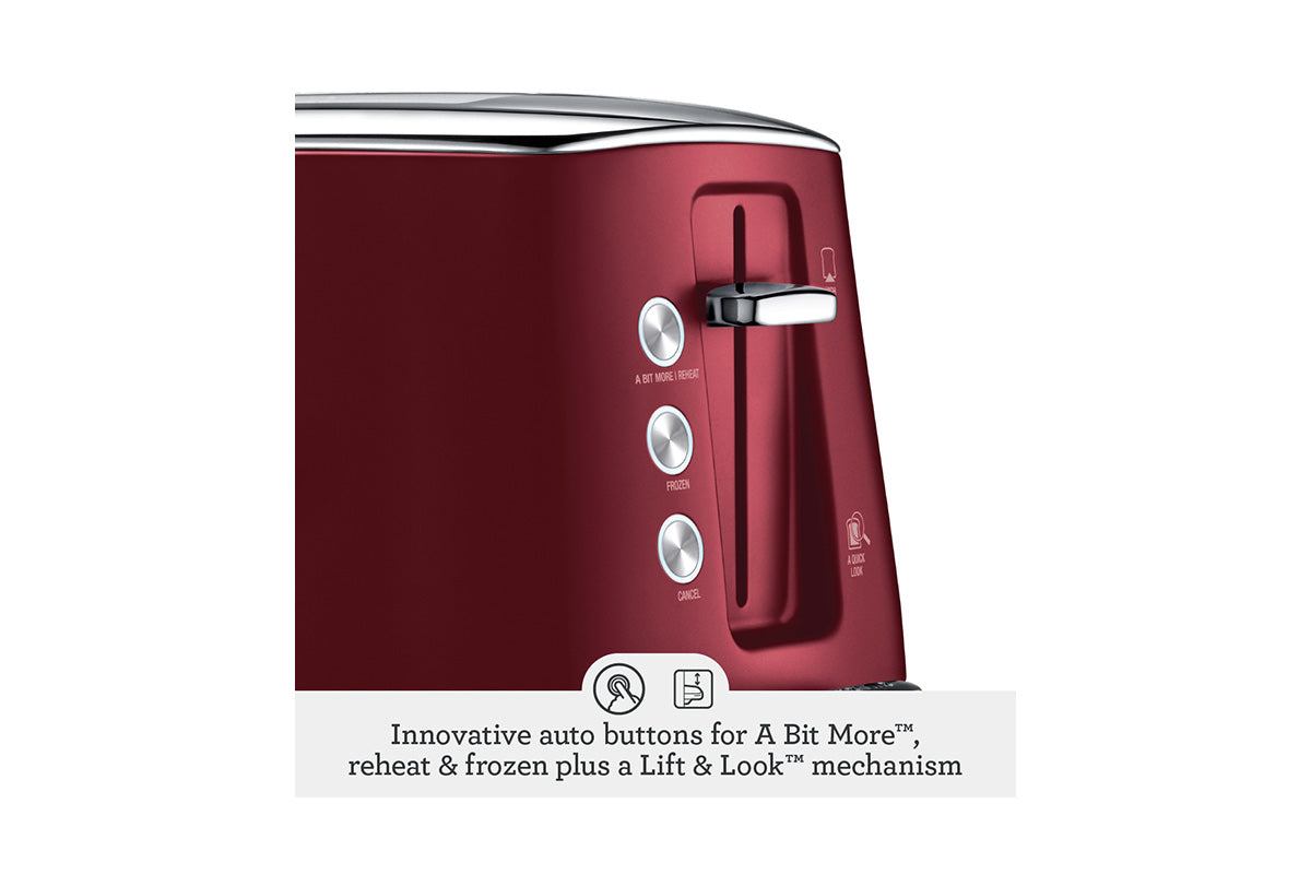 The toast select luxe adjusts the toasting time for each type of bread. A quick look to check if it's done. Press a bit M\more to give it just that a little bit more. Follow toasting progress with the LED countdown indicator. Crafted with brushed stainless steel in premium metallic finishes and chrome accents.