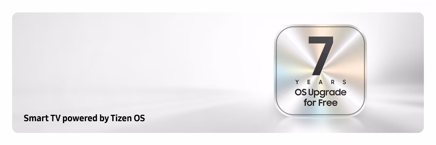 6. Tizen os upgrades are available for up to 7 years from the product’s release year starting in 2023. Availability, features, contents and services are subject to change without notice and may vary by product, model or region. The upgrade does not cover hardware related performance, features or durability. Samsung account login required and agreement to smart hub terms and conditions. Requires internet connection. Updates need to be enabled on device
