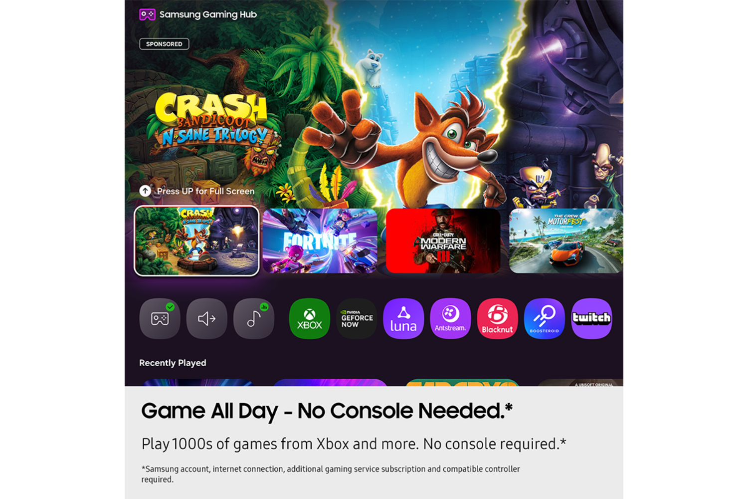 Samsung Gaming Hub brings together the biggest console and streaming games from Xbox and other industry-leading partners, all in on one place. With no downloads, storage limits or console required, just turn on your TV and play.[4]