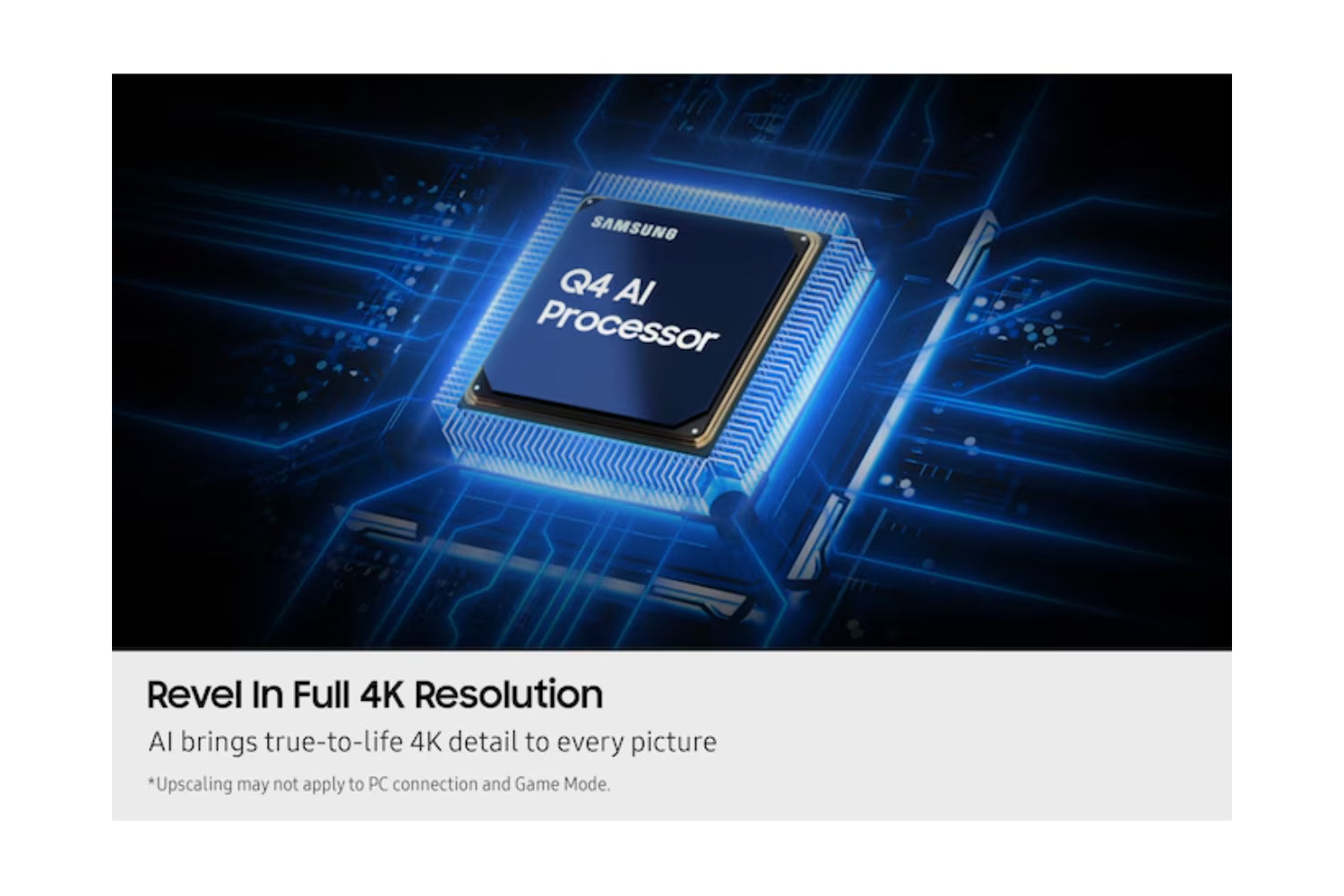 Experience optimised full 4K viewing with Samsung smart, adaptive AI processor. See every frame in crystal clarity and full colour with intelligent scene-by-scene upscaling for superb cinematic visuals.[1]