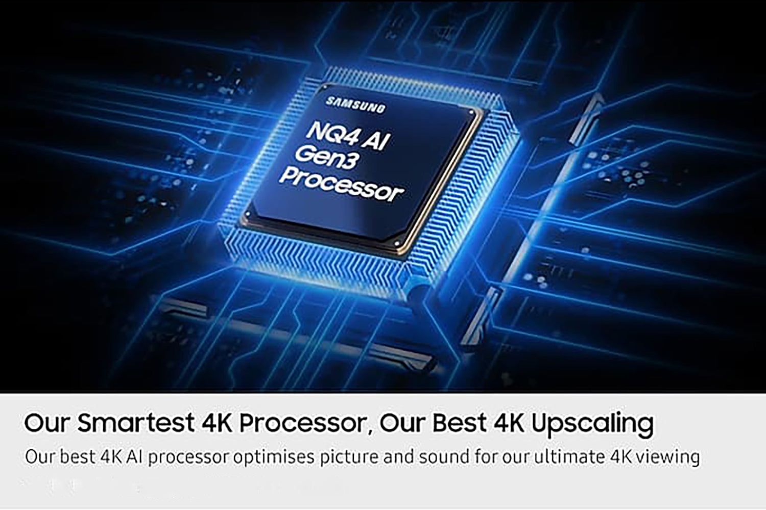 Experience Samsung most advanced 4K AI enhancements to your entertainment. Soak in sharpened upscaling that uses 128 neural networks to optimise picture and sound. From streaming to sports, watch in enhanced brightness, depth, contrast, motion, sound and resolution - for an exceptional 4K experience.[1]