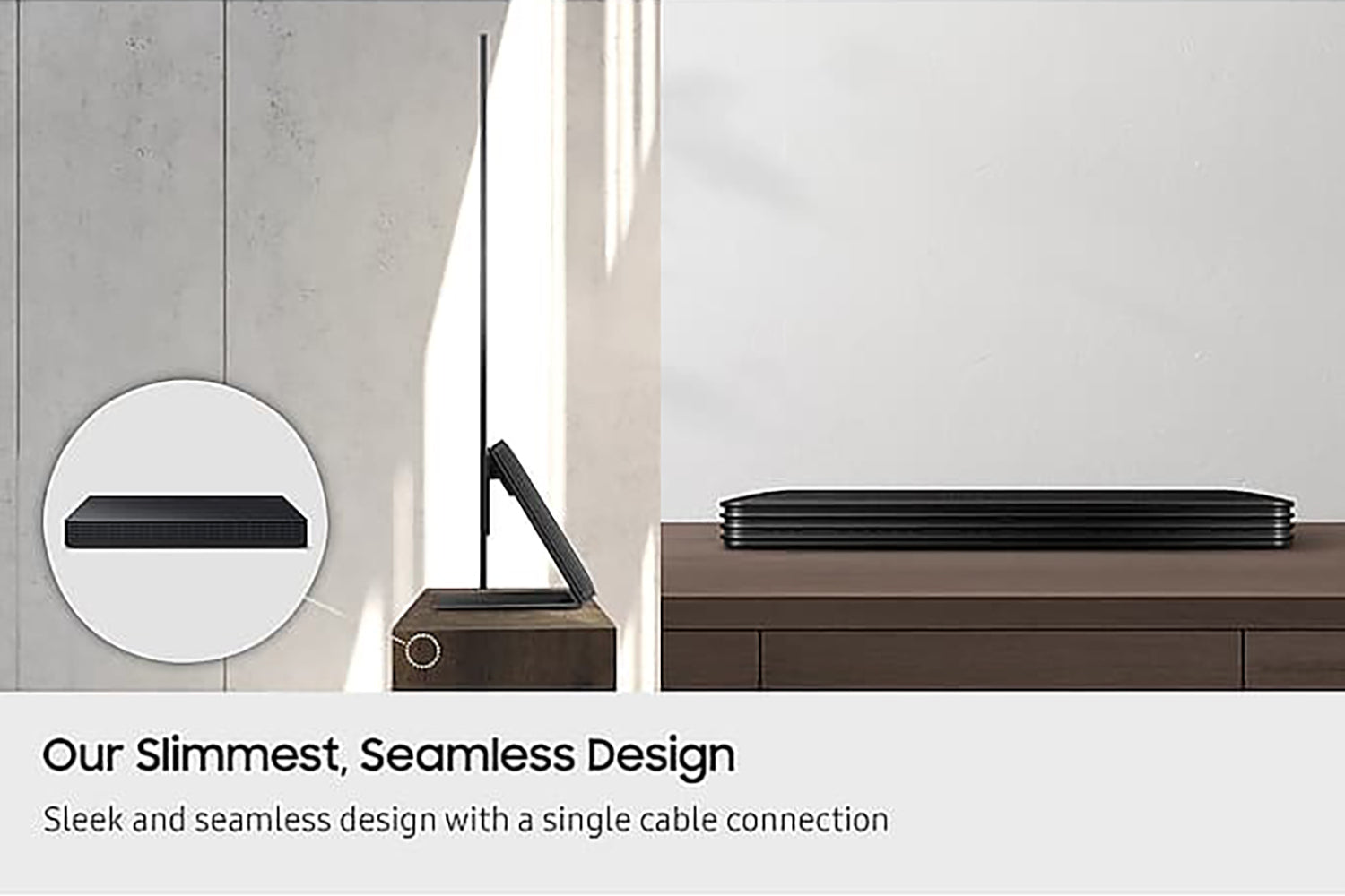 Samsung slimmest profile and the ultimate clean cable solution. With only one cable connecting to your TV, all of your devices plug into the One Connect Box rather than the back of your TV. Now you can place your devices up to 2.5m away, or even hidden away in a cupboard.