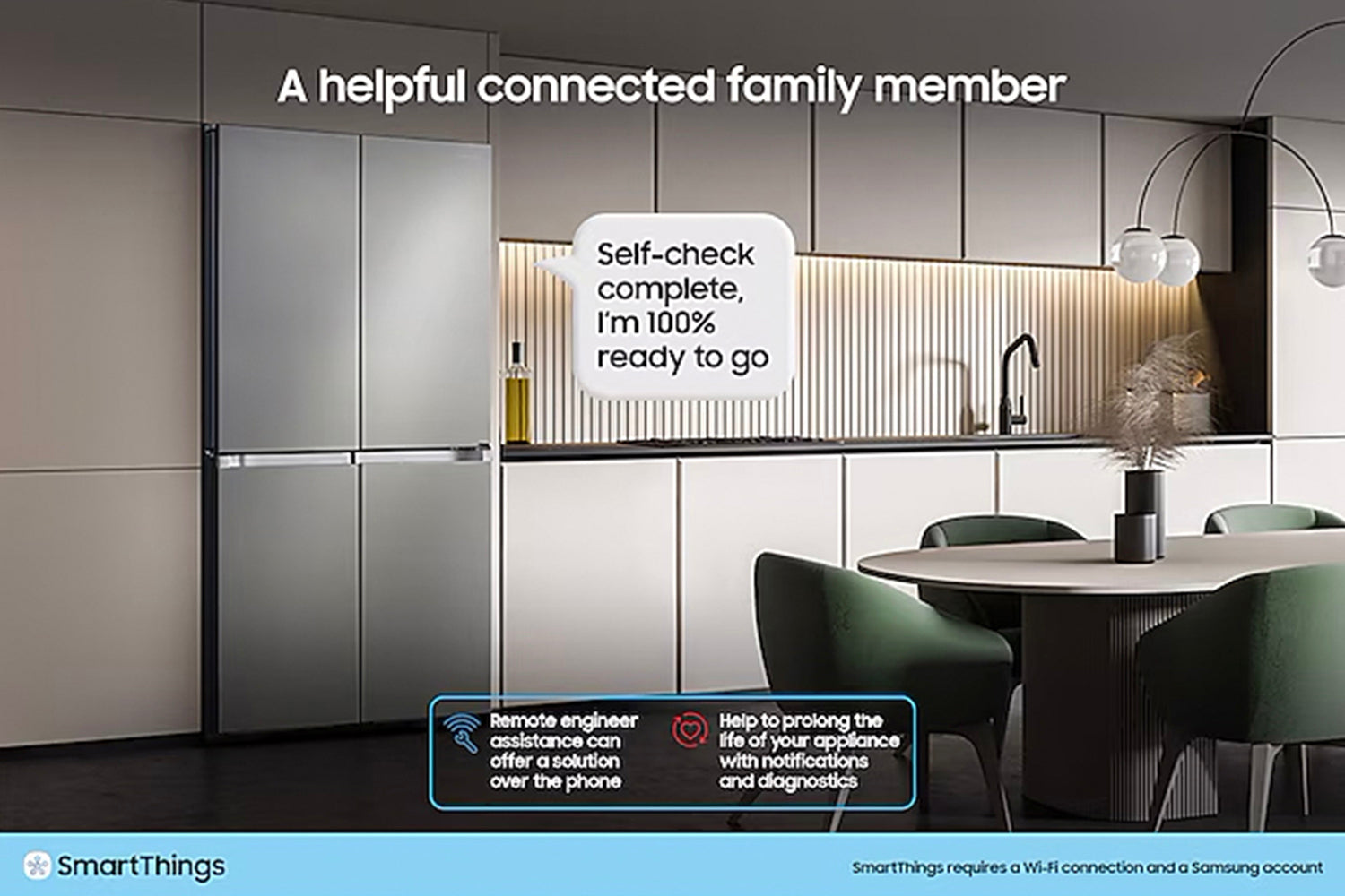 Monitor and take care of your refrigerator easily. SmartThings home care, provides real-time monitoring and alerts. You can check on the refrigerator's status, including the condition of the water filter and how often the door is opened. It also automatically notifies you if parts need replacing or possible problems are detected, such as spillage from the autofill pitcher. and suagests a solution to solve them.