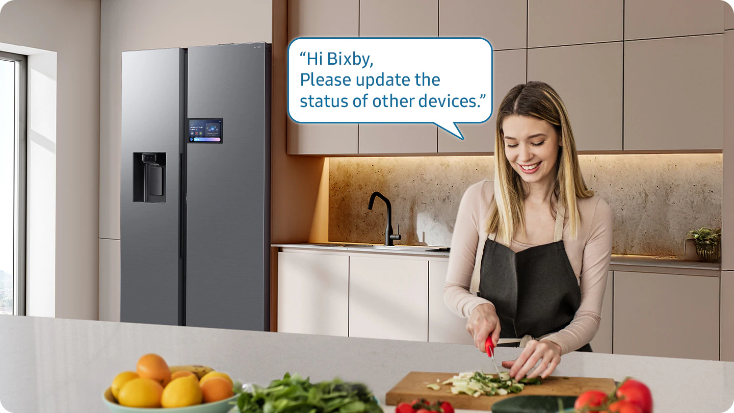 Control the refrigerator easily with just your voice. Built-in voice recognition capabilities allow you to speak commands and ask for information using Samsung Bixby*. So, even if your hands are full, you can control the settings and select functions. You can also use it to get recipe ideas and status updates on your other appliances or ask it to show instructional videos on the screen, like how to change the water filter.[2]