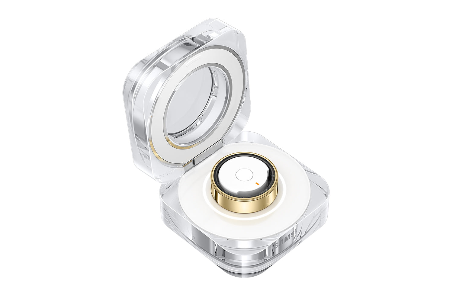 Even while charging in its crystal-clear Charging Case, the Galaxy Ring is a sight to behold. The delicate glow of the light around the Multi-purpose button indicates the battery charging level. The Charging Case can be charged wirelessly too, so simply place your Galaxy Ring securely in its case when you're on the go, and place it on a wireless charging pad for easy charging. [14][15][16]
