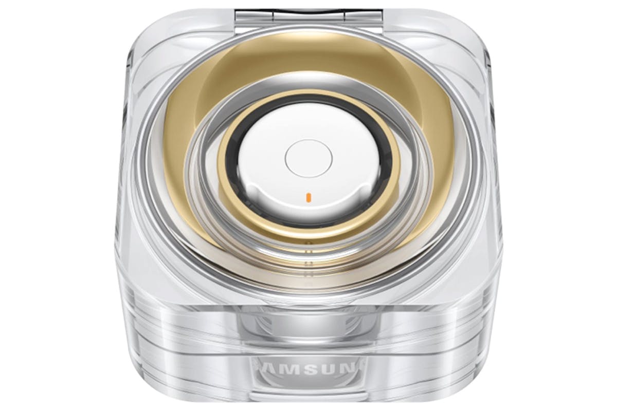 Even while charging in its crystal-clear Charging Case, the Galaxy Ring is a sight to behold. The delicate glow of the light around the Multi-purpose button indicates the battery charging level. The Charging Case can be charged wirelessly too, so simply place your Galaxy Ring securely in its case when you're on the go, and place it on a wireless charging pad for easy charging. [14][15][16]