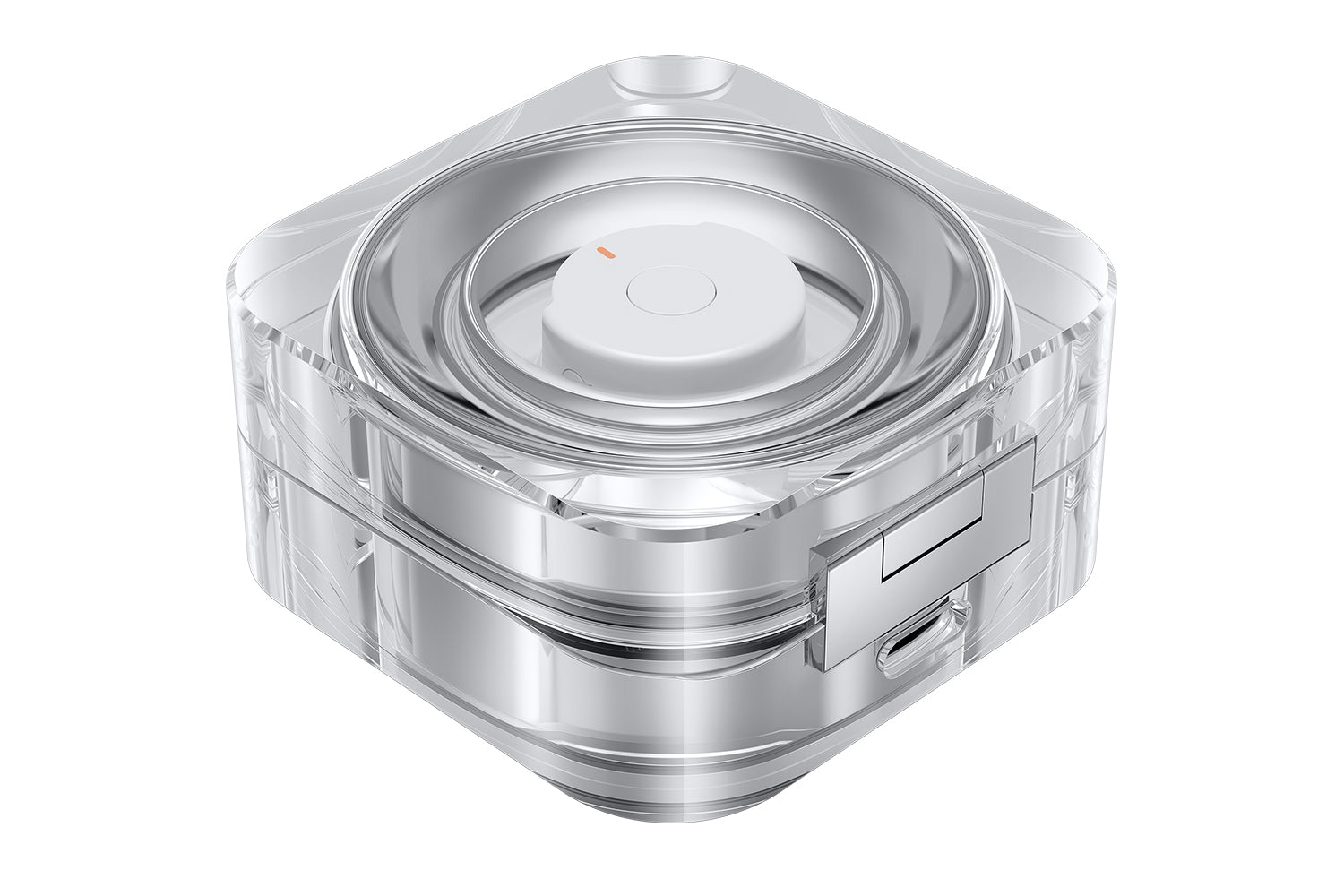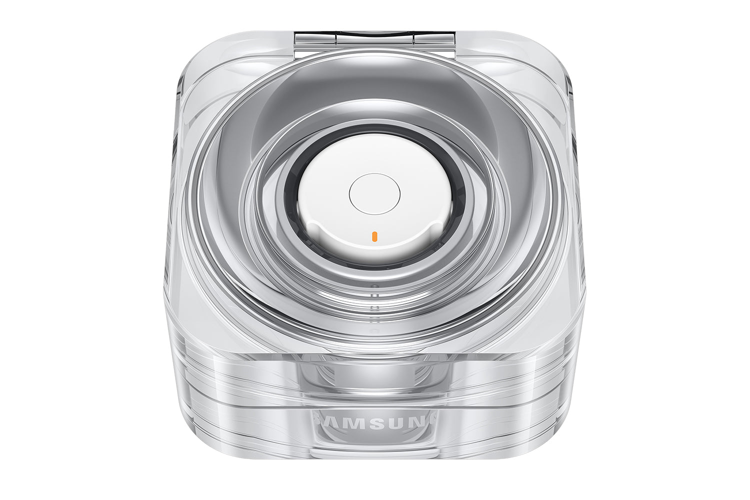 Even while charging in its crystal-clear Charging Case, the Galaxy Ring is a sight to behold. The delicate glow of the light around the Multi-purpose button indicates the battery charging level. The Charging Case can be charged wirelessly too, so simply place your Galaxy Ring securely in its case when you're on the go, and place it on a wireless charging pad for easy charging. [14][15][16]