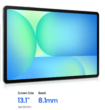 3. Model availability may vary depending on country, region or carrier.*Measured diagonally, Galaxy Tab S10 FE+'s screen size is 13.1" in the full rectangle and 13.0" accounting for the rounded corners accounting for the rounded corners. Actual viewable area is less due to the rounded corners and the camera hole.