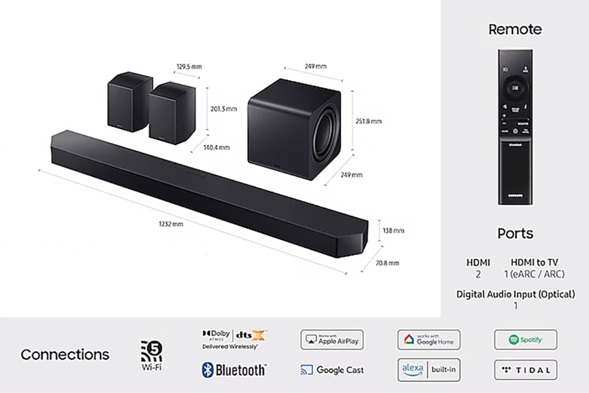 Amazon, Alexa, and all related logos are trademarks of Amazon.com, Inc. or its affiliates. Google, Google Cast and Google Home are trademarks of Google LLC. Apple, AirPlay, iPad, and iPhone are trademarks of Apple Inc., registered in the U.S. and other countries and regions. To use AirPlay with Samsung Soundbar, the latest version of iOS, iPadOS or macOS is recommended. Feature availability and content service may vary by region/service provider/language. To connect a soundbar to a mobile device via a wireless network (Wi-Fi), the SmartThings app is required.