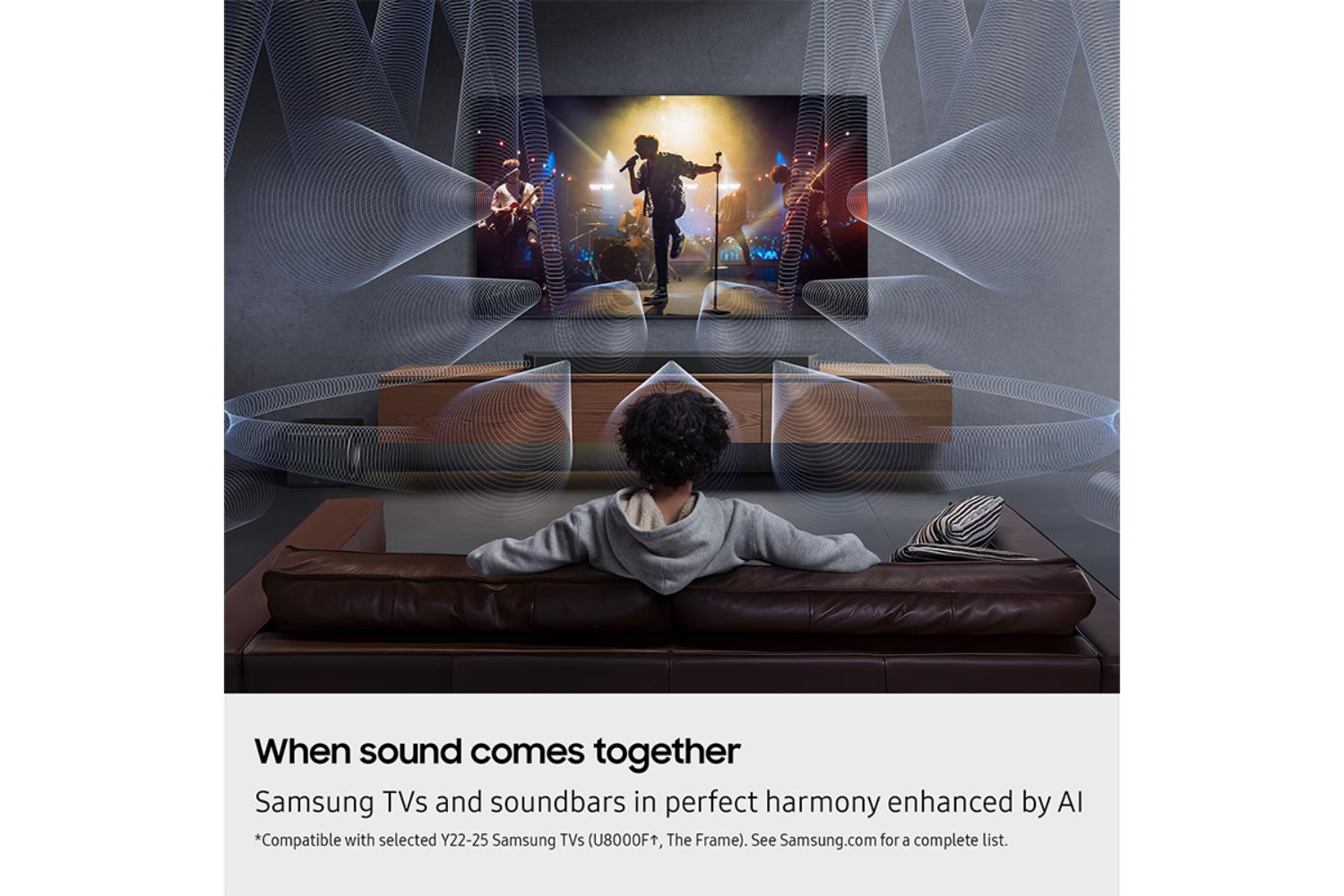 Boost your viewing experience with integrated sound from your TV and soundbar, effortlessly synced with AI. Relax and let Q-Symphony handle the rest. Elevate your audio, perfected by Samsung.