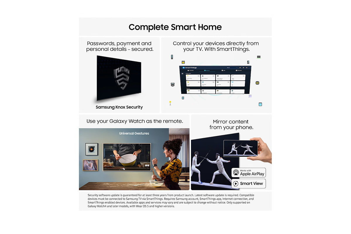 18. Secured by Knox applies to Samsung TVs powered by Tizen®, launched since 2015. Security software update is guaranteed for at least three years from product launch. Latest software update is required. Must be connected to Samsung TV via SmartThings.