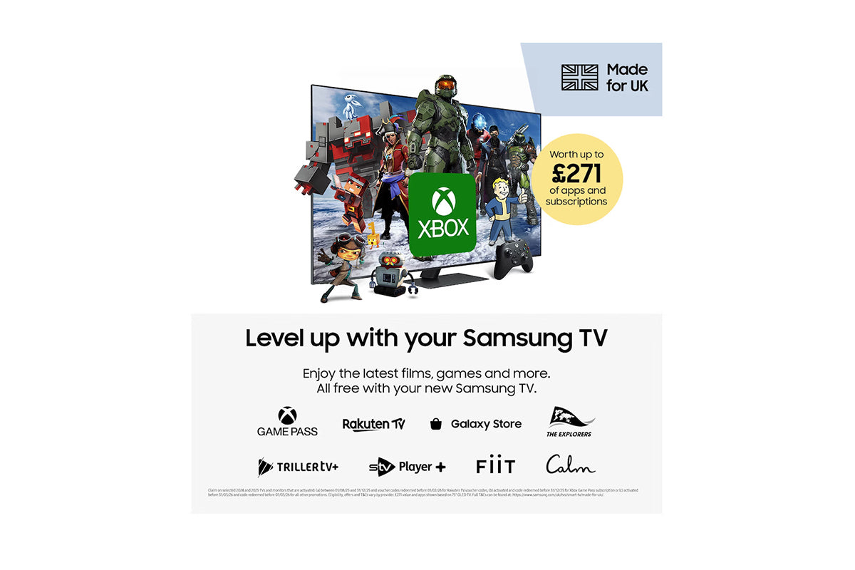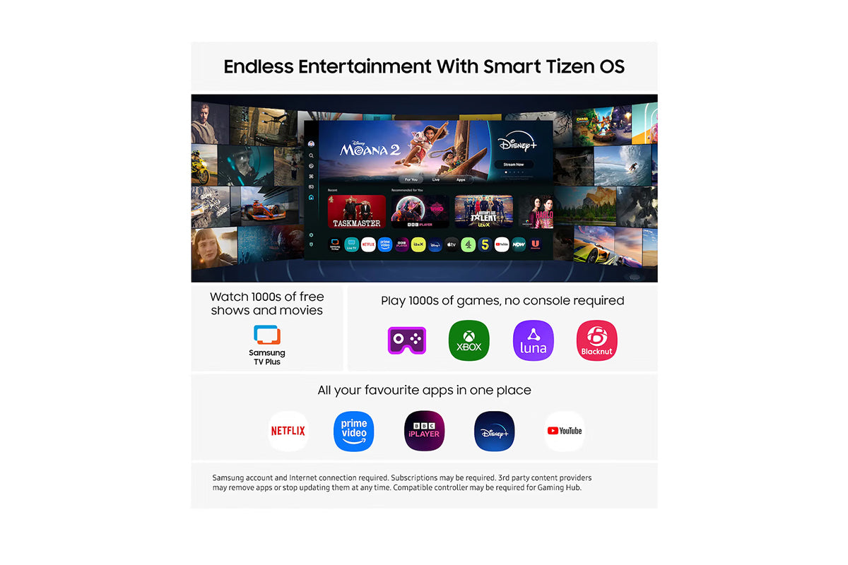 Spend less time searching and more time watching. With BBC iPlayer, Netflix, Disney+, YouTube, Xbox and more, get personalised recommendations and instant access to the latest shows and movies on the best streaming apps. Plus access to 1,000s of extra TV Shows and Movies on Samsung TV Plus - all for free.[14]