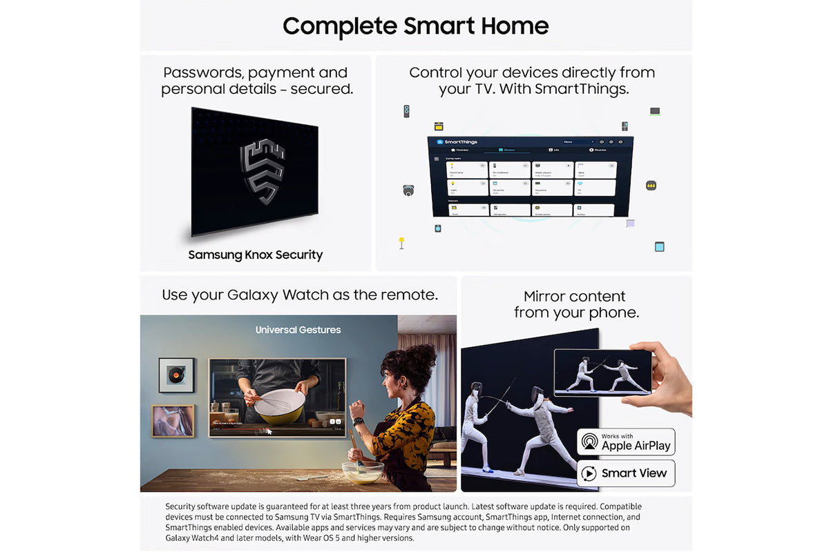 18. Secured by Knox applies to Samsung TVs powered by Tizen®, launched since 2015. Security software update is guaranteed for at least three years from product launch. Latest software update is required. Must be connected to Samsung TV via SmartThings.