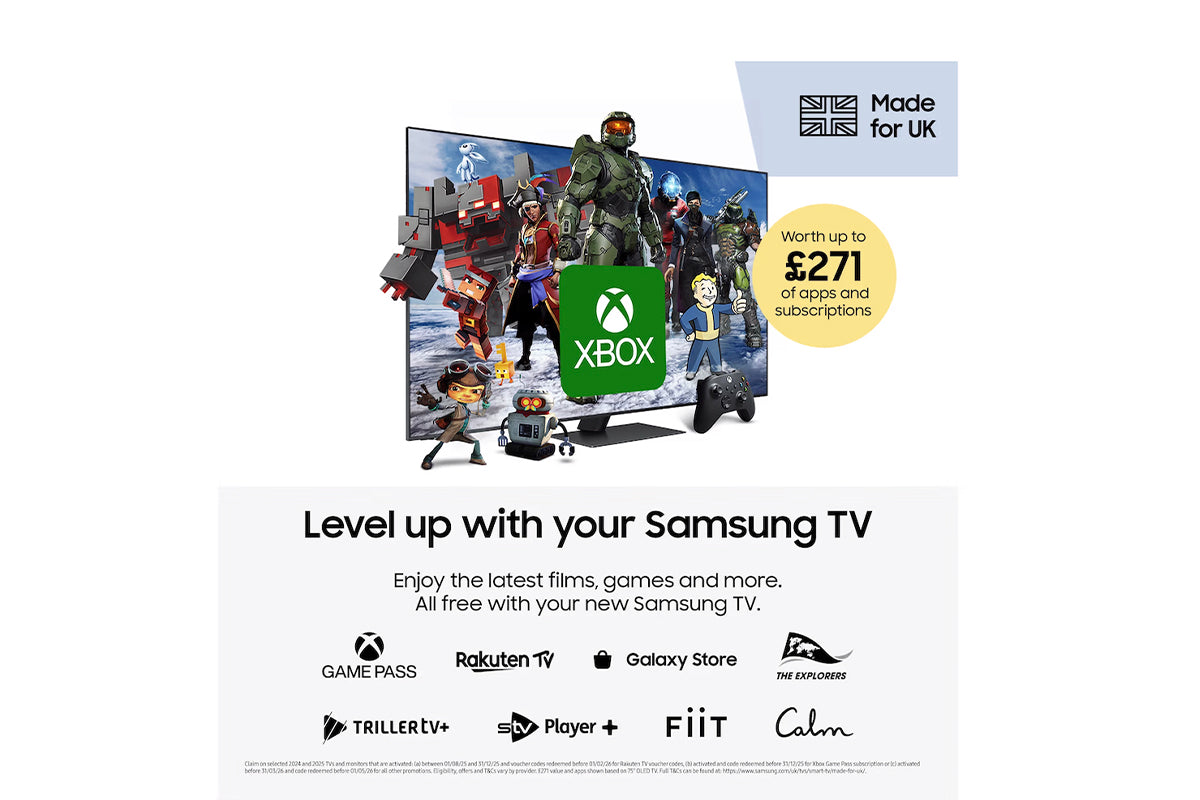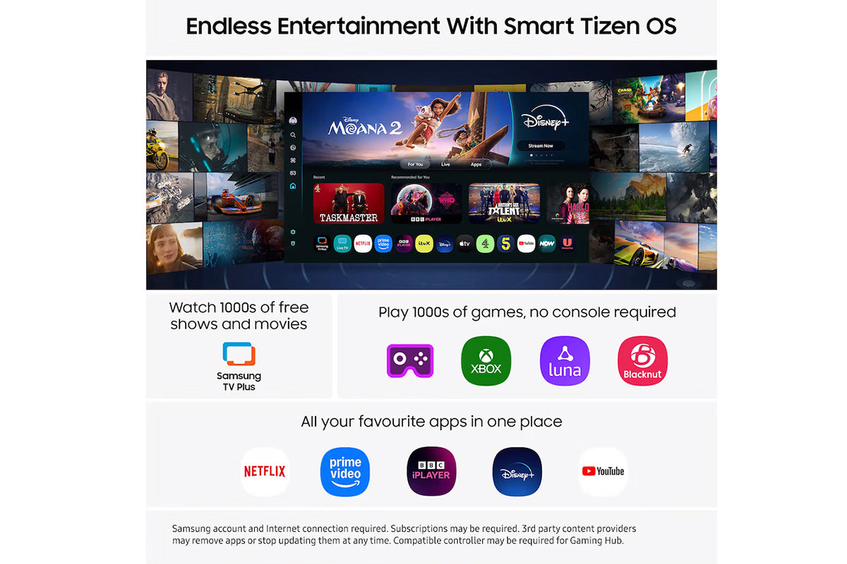 Spend less time searching and more time watching. With BBC iPlayer, Netflix, Disney+, YouTube, Xbox and more, get personalised recommendations and instant access to the latest shows and movies on the best streaming apps. Plus access to 1,000s of extra TV Shows and Movies on Samsung TV Plus - all for free.[14]