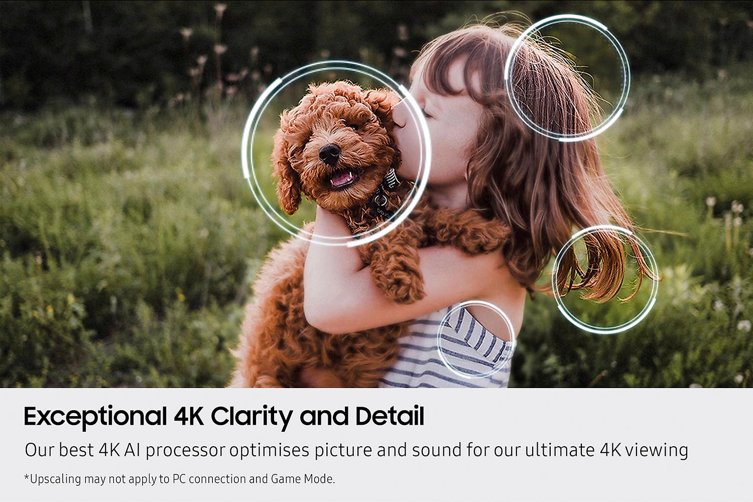 Experience Samsung most advanced 4K AI enhancements to your entertainment. Soak in sharpened upscaling that uses 128 neural networks to optimise picture and sound. From streaming to sports, watch in enhanced brightness, depth, contrast, motion, sound and resolution - for an exceptional 4K experience.[1]