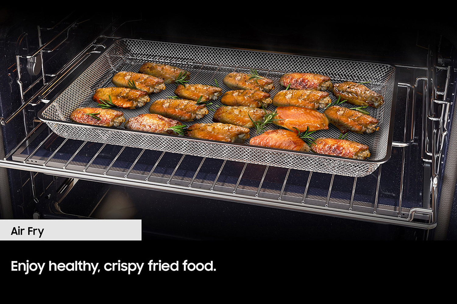 Enjoy healthier fried food without a deep fryer. Air fry combines a special tray with hot air circulation that envelops food. It is the ideal way to cook chips and vegetables as it eliminates excess fat, but everything is still crispy and brown outside and juicy inside.