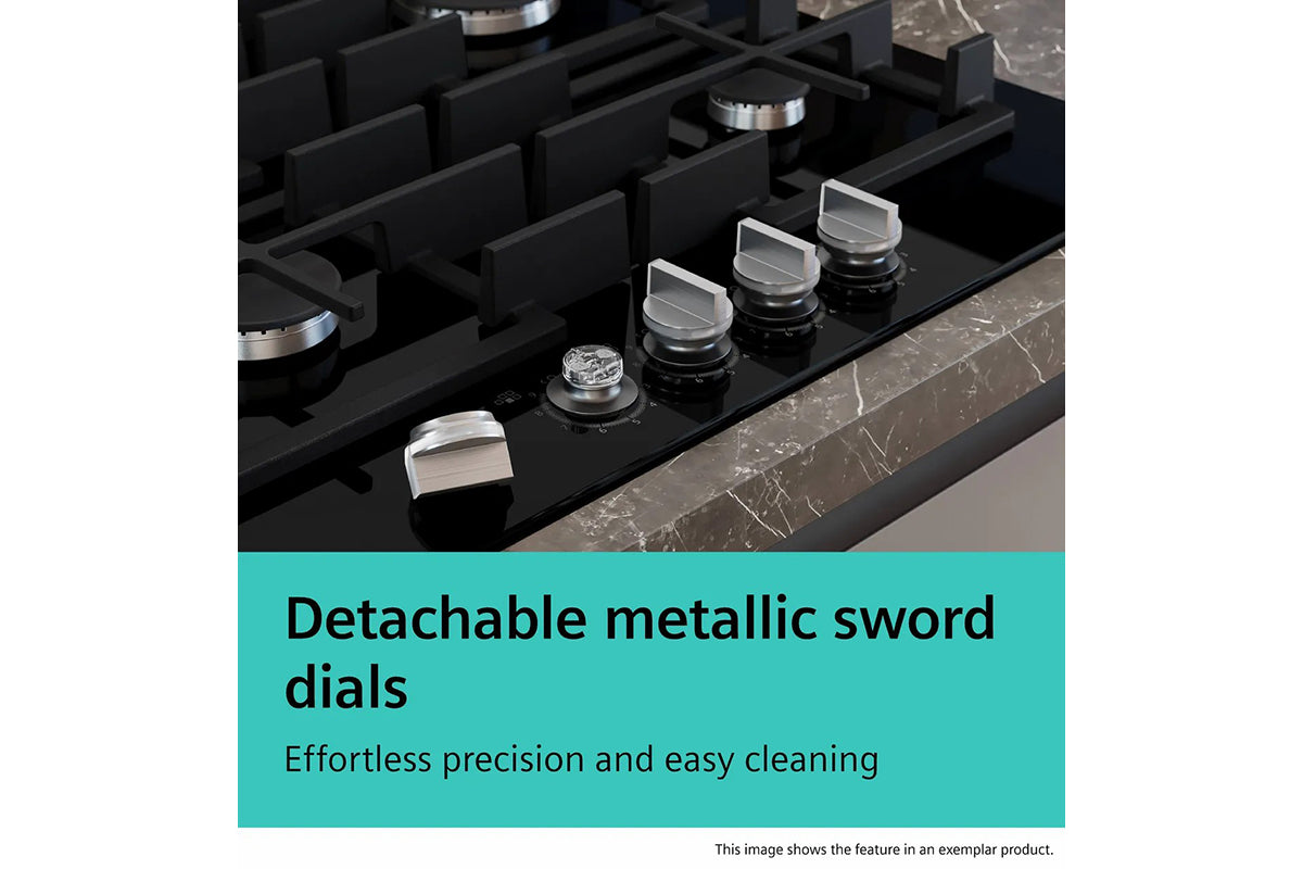 Cleaning made easier than ever with Siemens gas hob's detachable metallic sword dials. Made from durable materials, they provide a firm grip and precise control, while being simple to remove for quick, thorough cleaning.