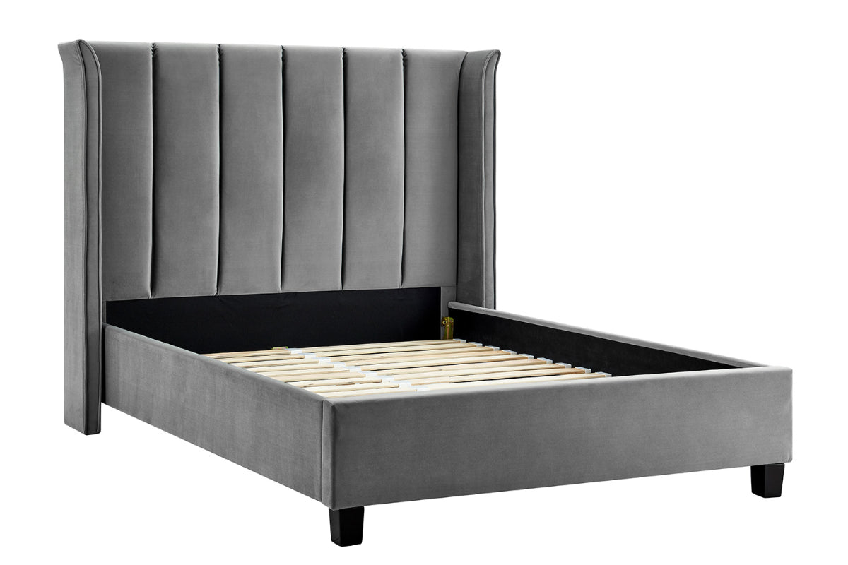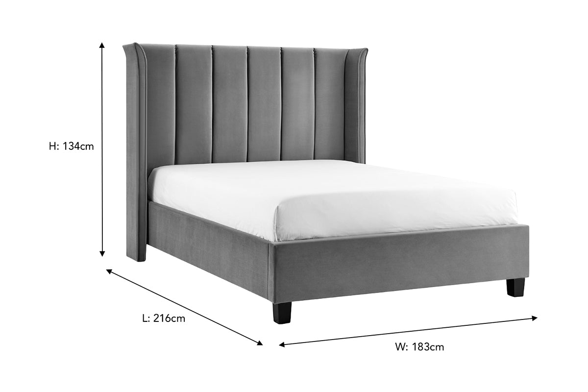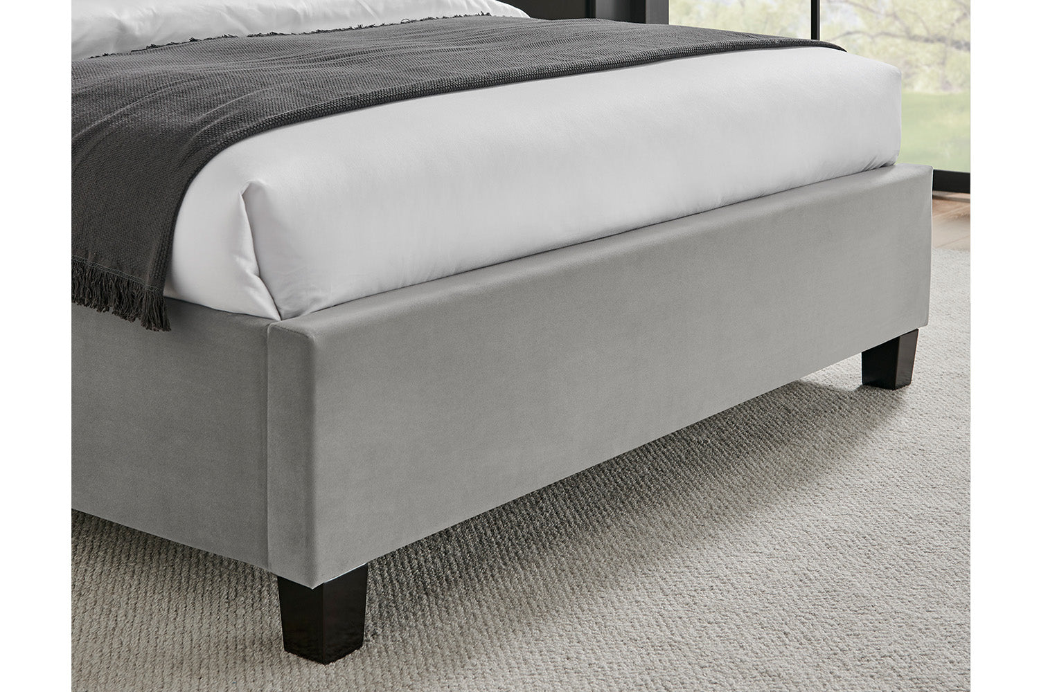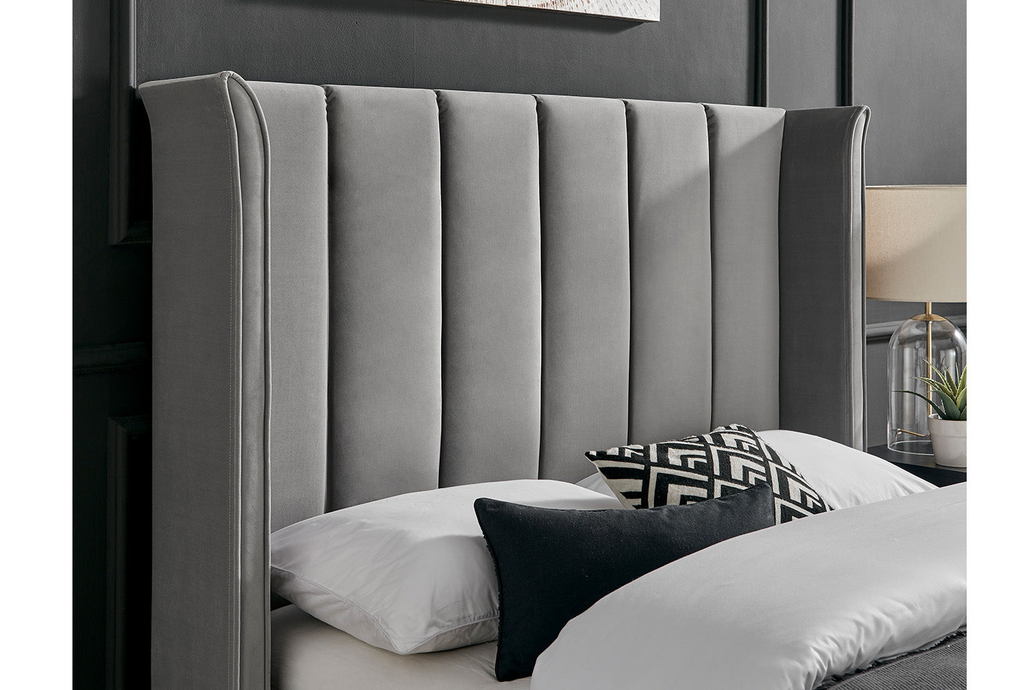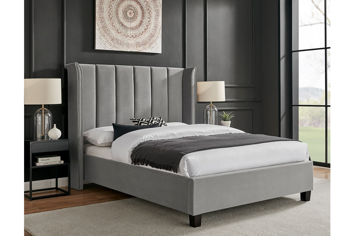 Boasting a gentle curved tip profile and luxurious velvet upholstery, the Sirius bedframe is soft in every sense. It features a padded linear design in the headboard that provides the perfect backdrop for late night reading adding further comfort. Available in a choice of colours, from eye-catching emerald-green to tranquil grey, it can either make a bold style statement or transform your space into a soothing sanctuary. Crafted from wood with a wooden slatted base this bedframe ensures durability and long lasting support.