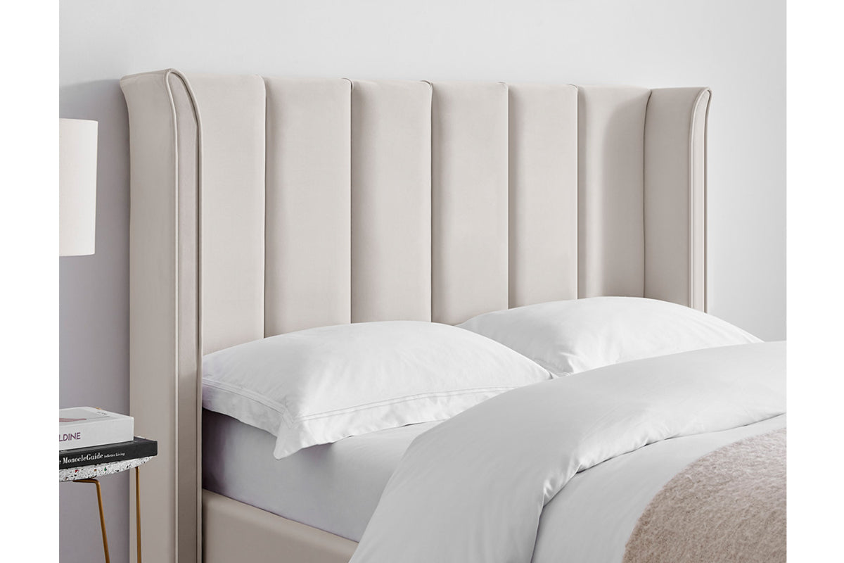 Boasting a gentle curved tip profile and luxurious velvet upholstery, the Sirius bedframe is soft in every sense. It features a padded linear design in the headboard that provides the perfect backdrop for late night reading adding further comfort. Available in a choice of colours, from eye-catching emerald-green to tranquil grey, it can either make a bold style statement or transform your space into a soothing sanctuary. Crafted from wood with a wooden slatted base this bedframe ensures durability and long lasting support.