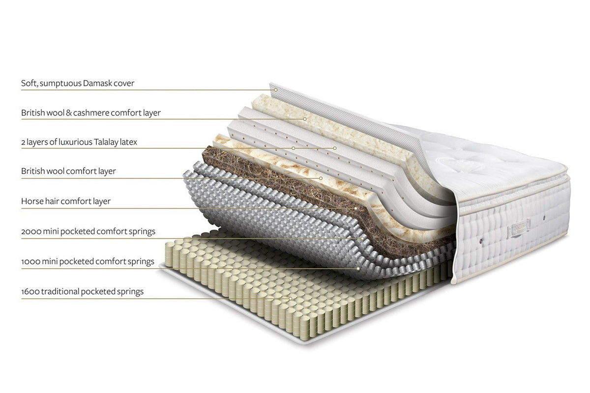 The Sovereign 4600 mattress is comprised of exquisite materials designed to ease you into your most blissful sleep ever. Starting with the soft and sumptuous damask cover which is a luxurious fabric that is kind on the skin. This is wrapped around British wool and cashmere comfort layers that help regulate body temperature and wick moisture. It also includes a layer of natural horsehair which is incredible strong, springy, and flexible, ensuring continuous comfort and support over time.