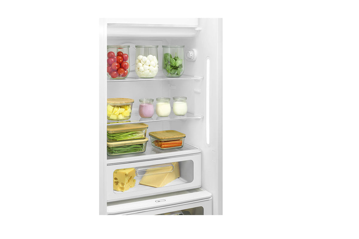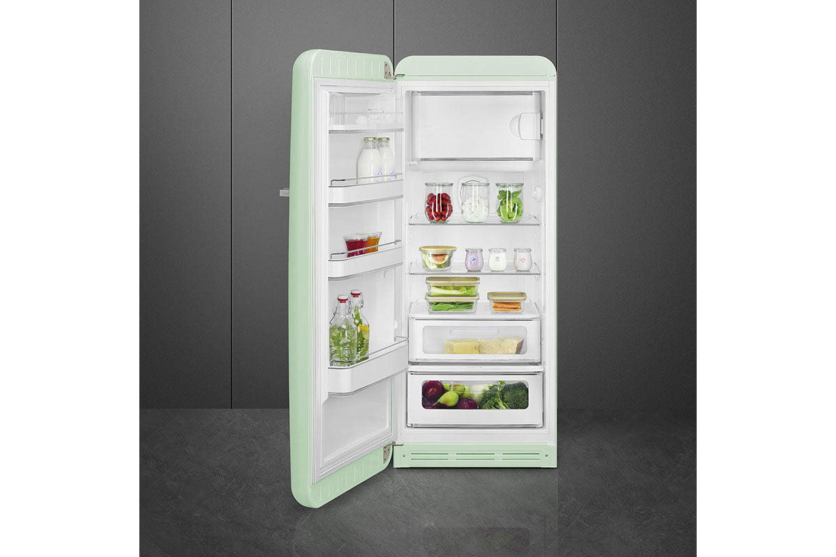 The iconic coloured 50's style design refrigerator with internal freezer compartment, perfect for adding character to the kitchen or living room without sacrificing cooling performance and the convenience of a practical and functional interior.
