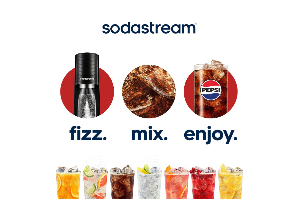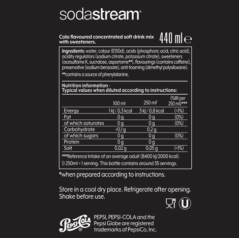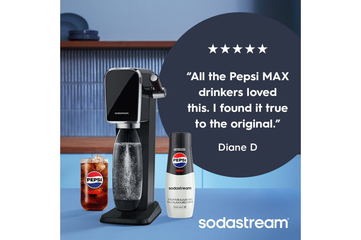 Perfect for parties and ideal as a diet mixer or for making your favourite cocktails (or mocktails). Each 440ml bottle of flavouring cola syrup makes up to 9 litres of flavoured soda water, meaning you're getting great value when compared to pre-packaged and pre-mixed bottled drinks, with no need for heavy shopping trips. By creating flavoured water with SodaStream, you're saving single-use bottles and cans. Enjoy the great taste of Pepsi MAX while making a more sustainable choice. Just the way you like it, at the push of a button.