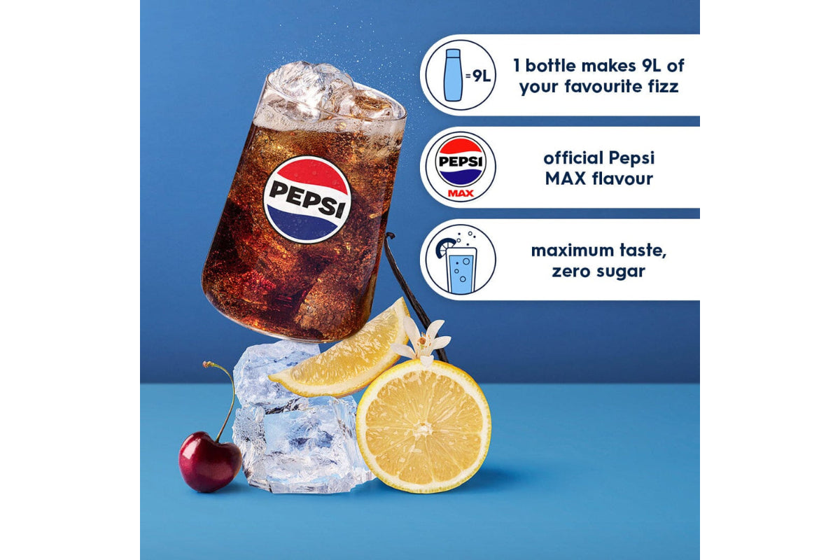 SodaStream x Pepsi MAX syrup brings the bold, sugar free taste of Pepsi MAX to your home, letting you create your favourite flavoured sparkling water in seconds. SodaStream Pepsi MAX syrup mix is carefully crafted to ensure the same refreshing cola flavour you know and love, with zero sugar and maximum taste. When used with any SodaStream sparkling water maker, you can customise the fizz to suit your preference. You can also use less syrup for a lighter taste or mix it with other SodaStream flavours to create unique drinks, it's as easy as FIZZ, MIX, and GO! (Always carbonate before adding syrups).
