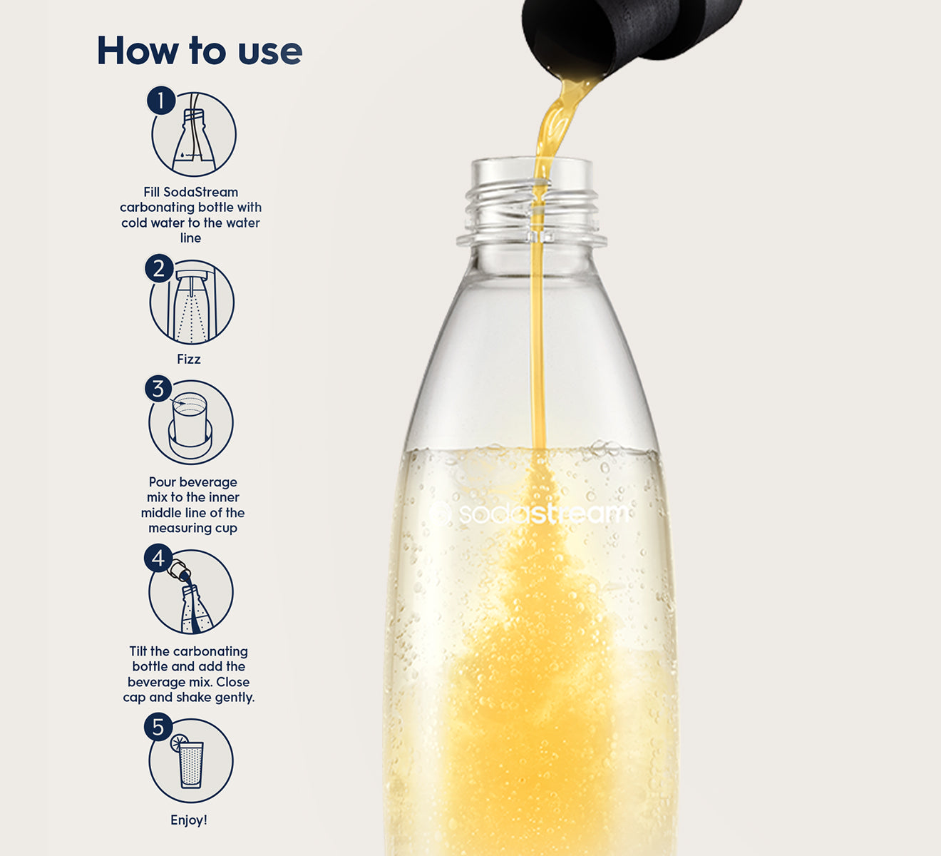 With just 1 bottle of mixture making up to 9 litres of flavoured sparkling water. Always fizz water before adding any flavour.